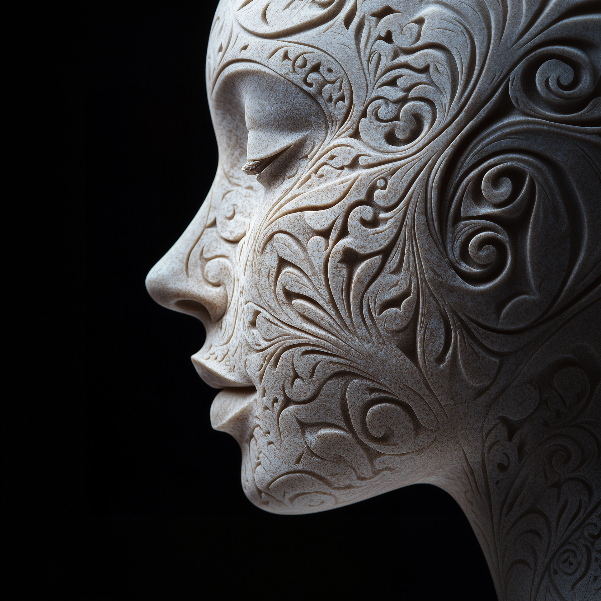 The image features a detailed side profile of a woman's face skillfully carved from stone. Intricate patterns embellish the surface, creating a captivating and artistic appearance.