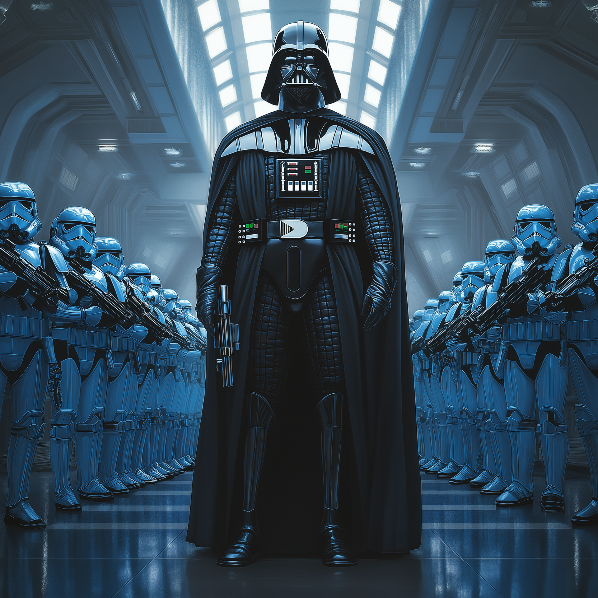 This illustration features a full-body depiction of a character resembling Darth Vader, donning a police belt associated with an NYPD chief. The scene is set in a spacious room with royal blue stormtroopers looking up in awe, creating a striking contrast and unique atmosphere.