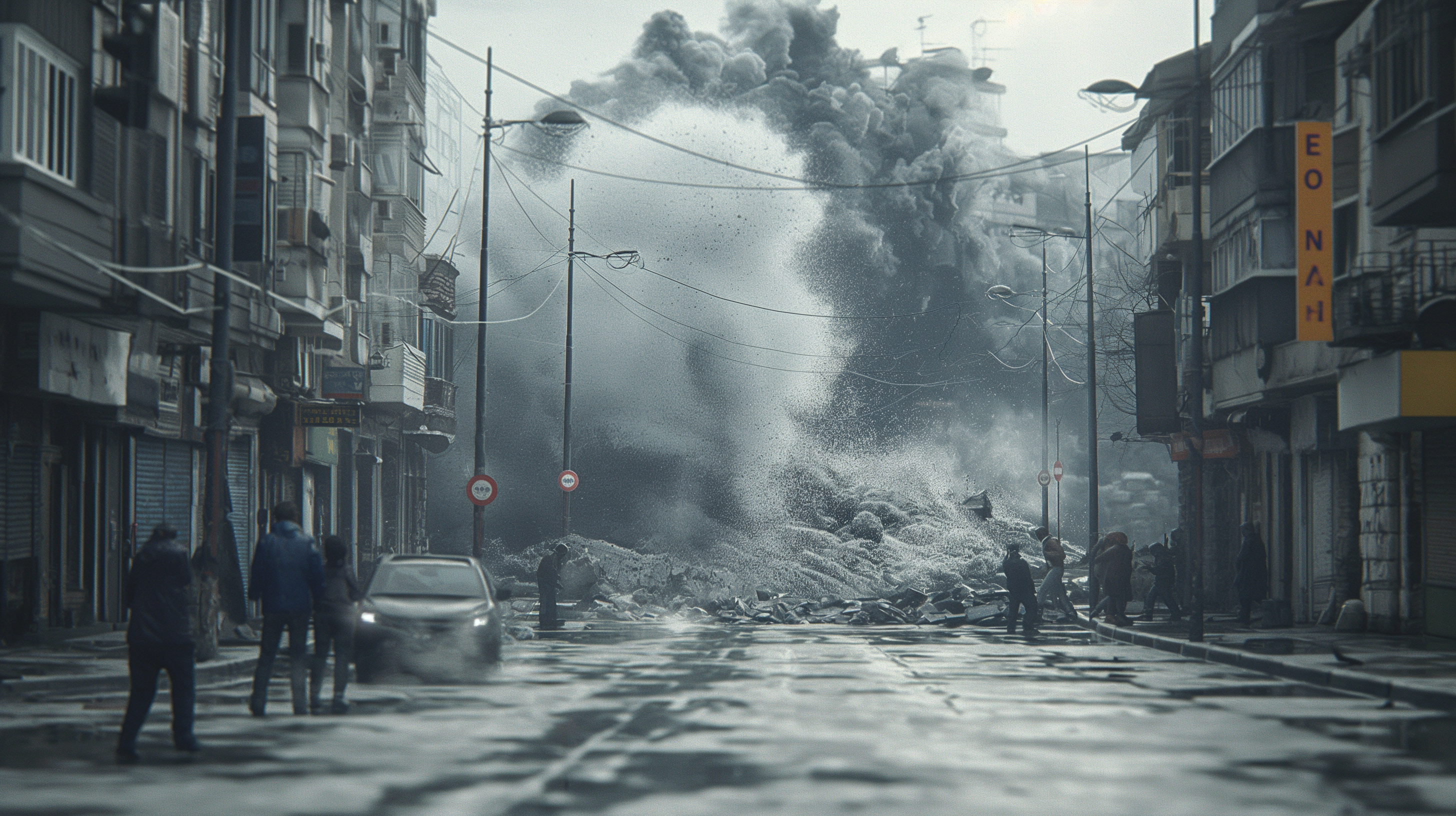 A group of people observe an enormous explosion at the end of a cloudy, debris-strewn city street.