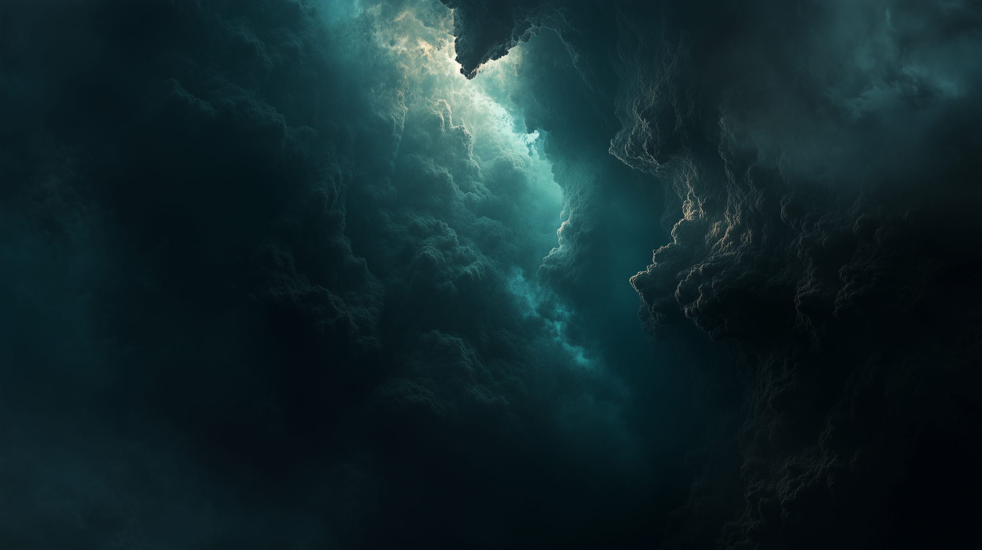 The image captures dark moody storm clouds with dramatic contrasts of shadow and light. A subtle blue hue adds an emotional and epic quality, enhancing the cinematic feel of the scene.