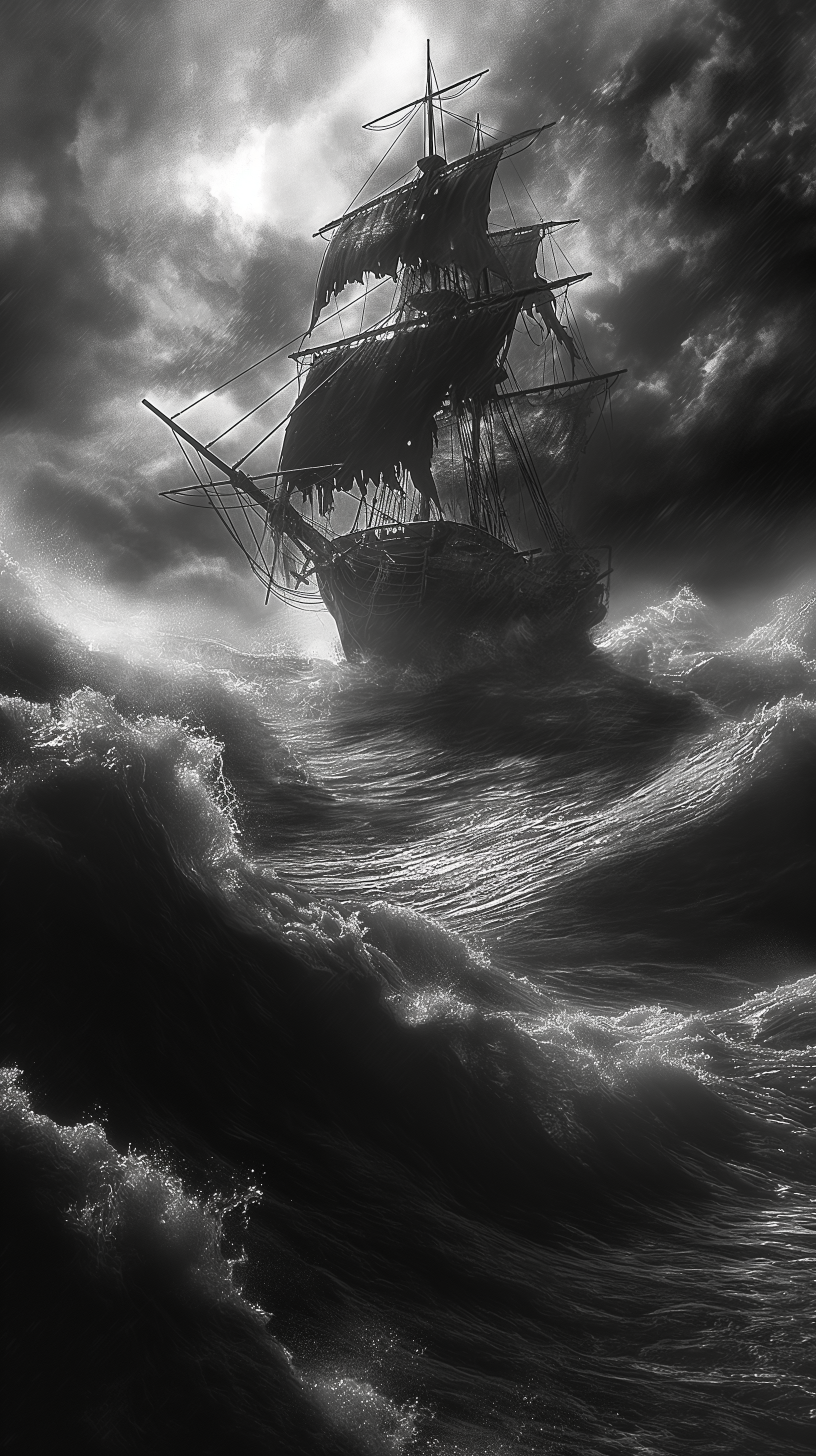A haunting image of a ghostly pirate ship sailing through rough waters under a stormy black and white sky, creating a sense of mystery and danger.