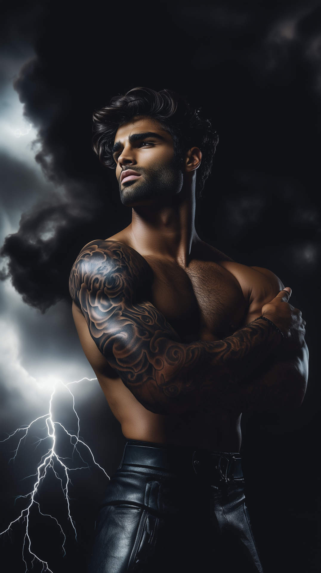 The image portrays a tall, muscular young man with tan skin and striking dark features, standing confidently with his arms crossed. The dramatic backdrop of a stormy sky, complete with swirling shadows and lightning, adds an intense atmosphere to the scene.