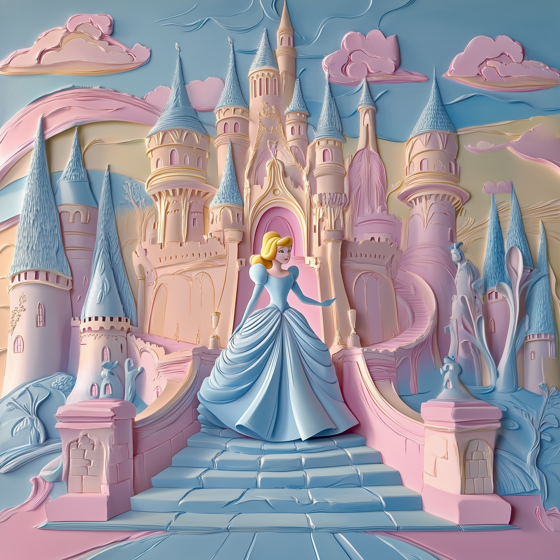 This illustration features a beautiful rendition of Cinderella within her castle, depicted in a very realistic and sharp style. The use of pastel colors adds a soft and whimsical ambiance to the scene, bringing the fairy tale to life.