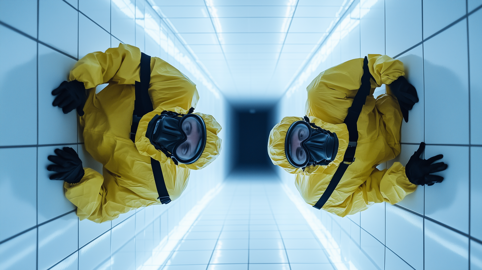 The image depicts an infinitely long white square tunnel, with identical walls all around. In a surreal twist, two men in yellow biohazard suits and black masks are seen standing upside down on the ceiling, creating an eerie and disorienting atmosphere.