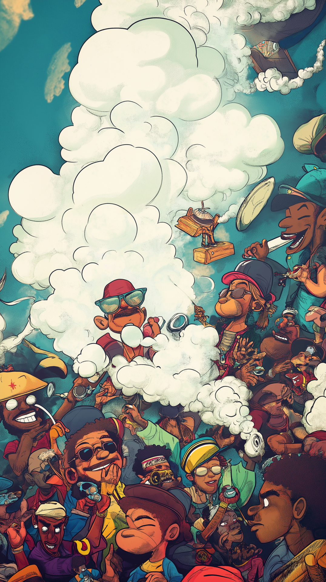 The image features three young men in stylish streetwear, adorned with gold chains, captured in a playful chibi art style. In the background, a vibrant neon sign reading 'Buy More!' adds a lively touch to the scene.