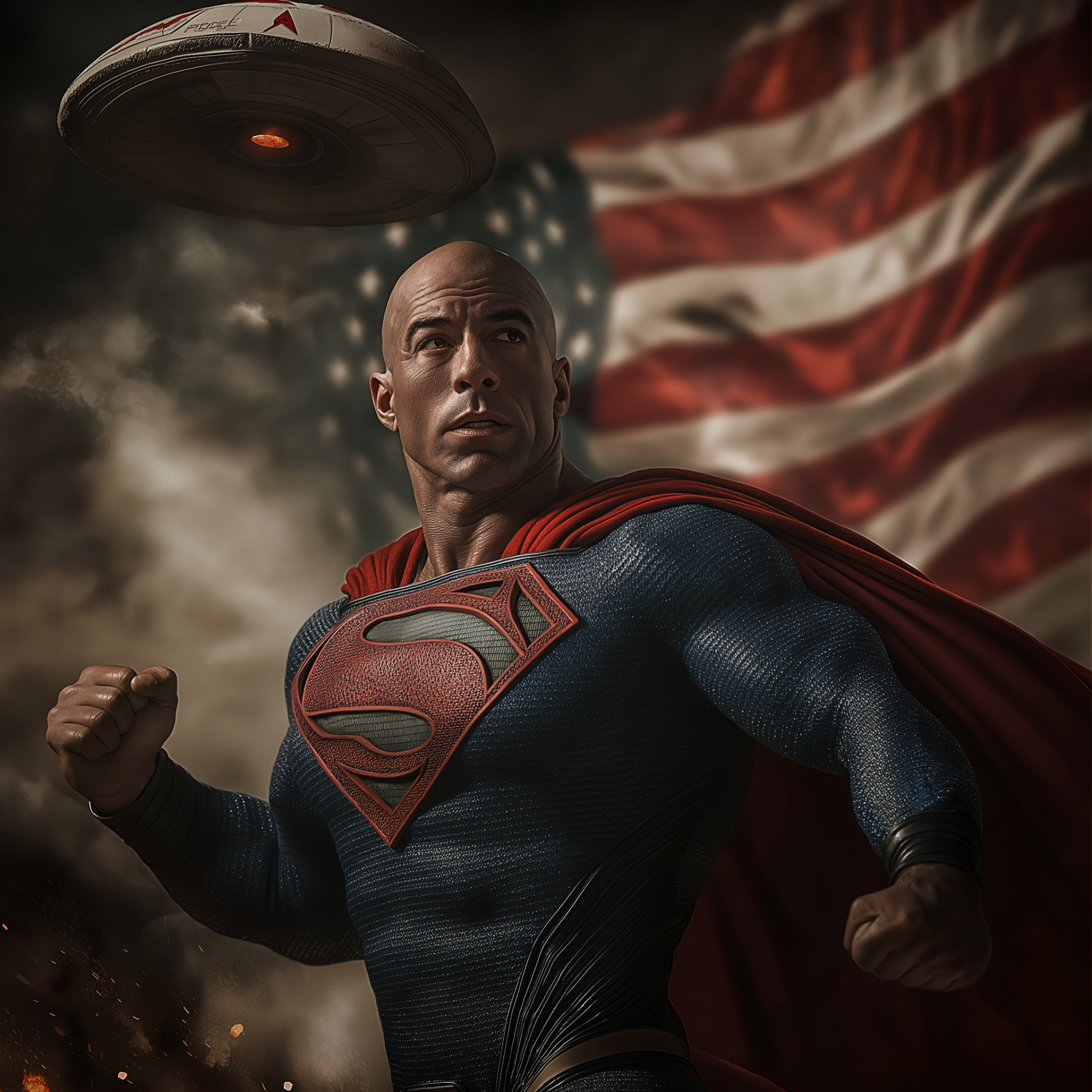 The image showcases a powerful figure dressed in a Superman suit, poised in battle against a UFO. The background features an American flag, adding an aspirational touch to this hyper-realistic scene.