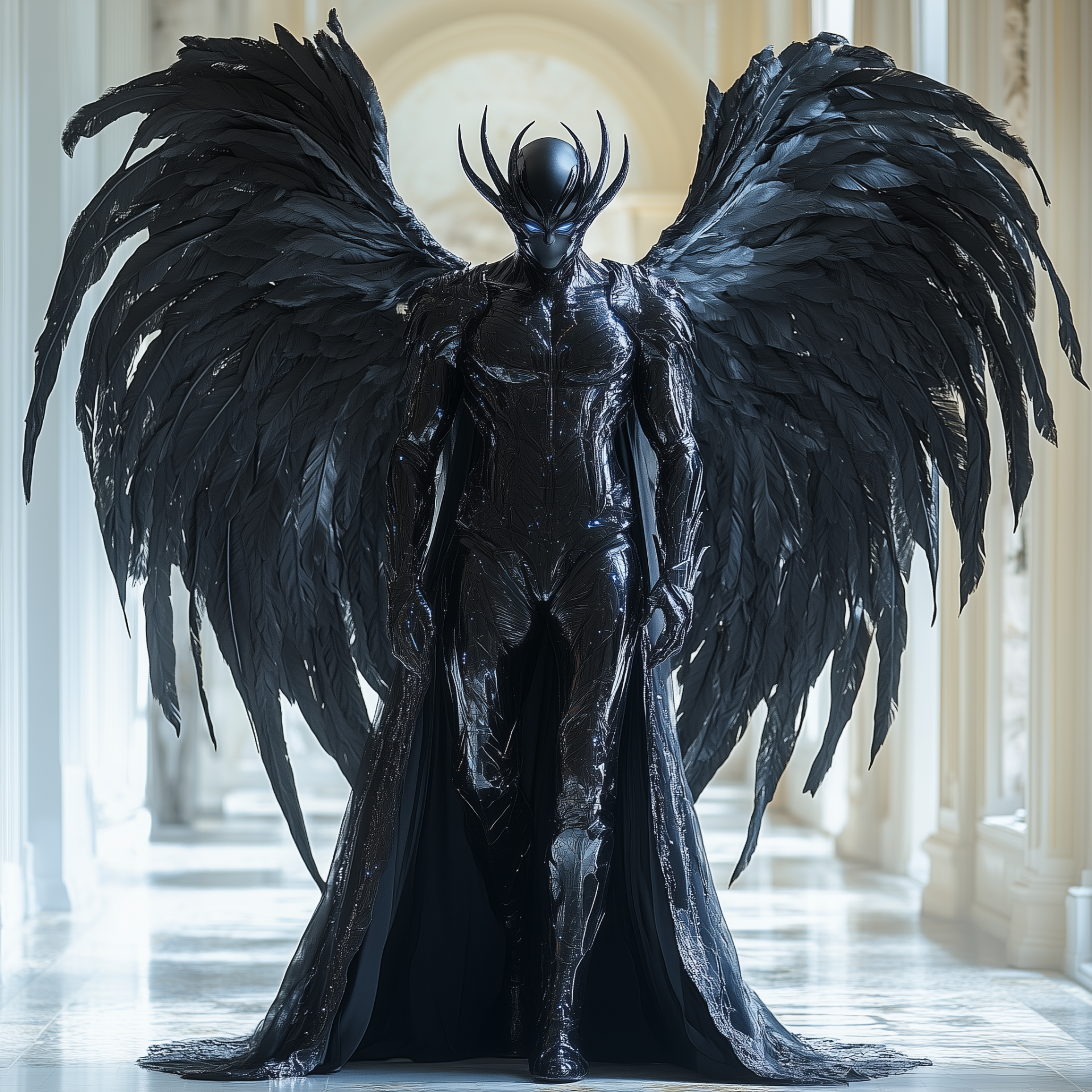 The image features a giant muscled man striking a powerful pose, showcasing his impressive physique. He is adorned with black sparkling wings and a futuristic uniform, exuding a sense of strength and intensity.