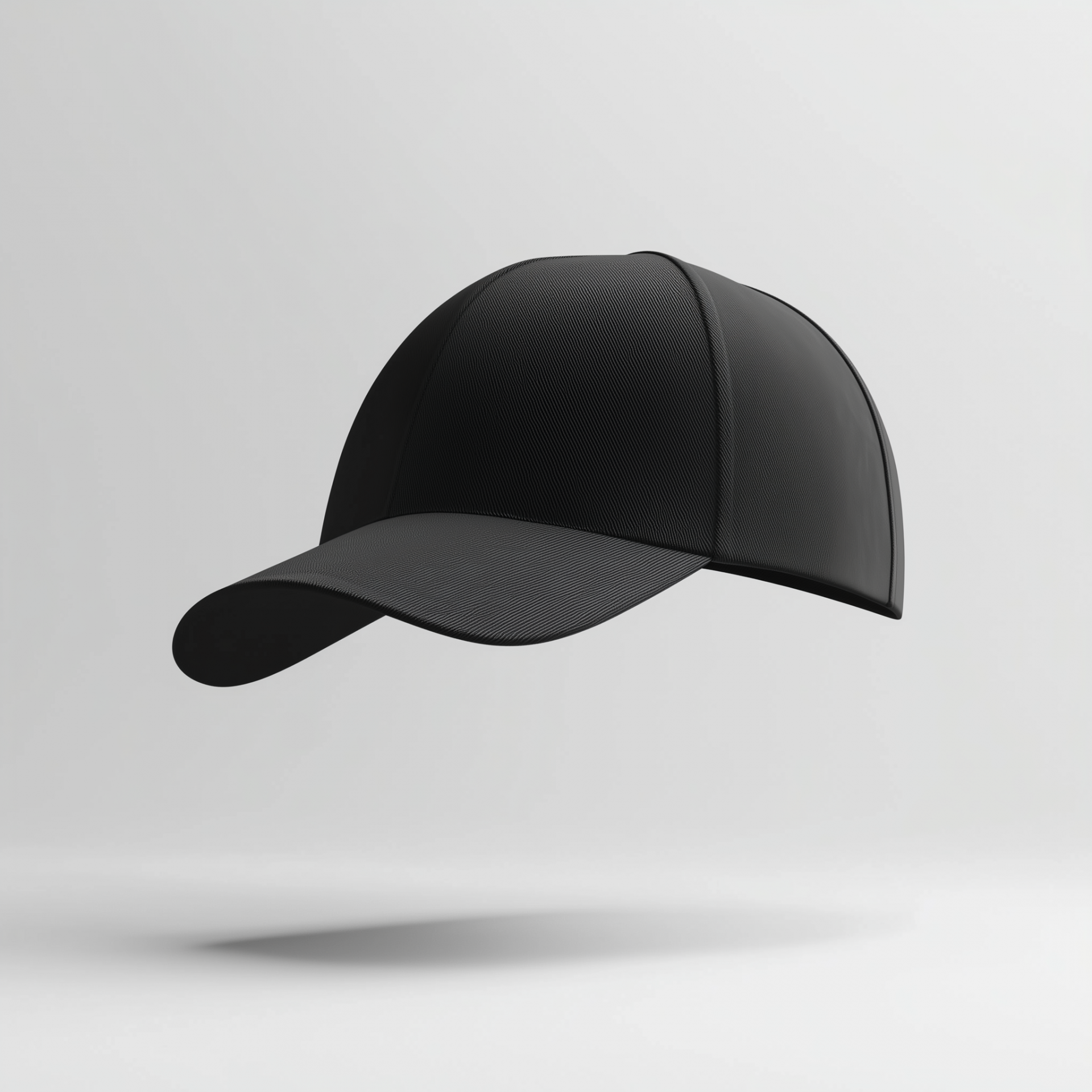 This image features a minimalistic 3D rendering of a pure black cap, seemingly defying gravity as it floats effortlessly in front of a bright white studio background. The stark contrast between the black cap and the white backdrop creates a striking, modern aesthetic.