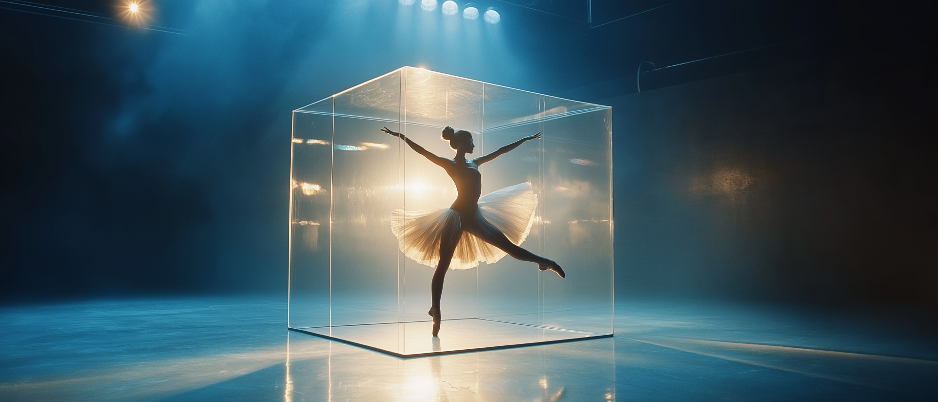 The image captures a stunning ballerina posed elegantly inside a perfect square glass box, surrounded by dramatic lighting. The warm glow from a tungsten spotlight enhances the cinematic feel, reminiscent of a high-profile fashion campaign.