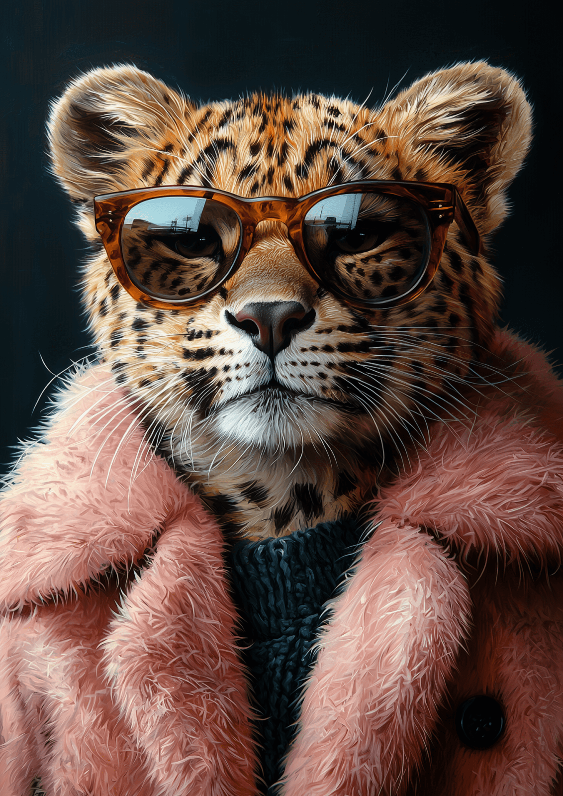 This illustration features a leopard confidently wearing sunglasses and a vibrant pink fur coat. The artwork is expressive, showcasing bold colors and a whimsical style reminiscent of contemporary art.
