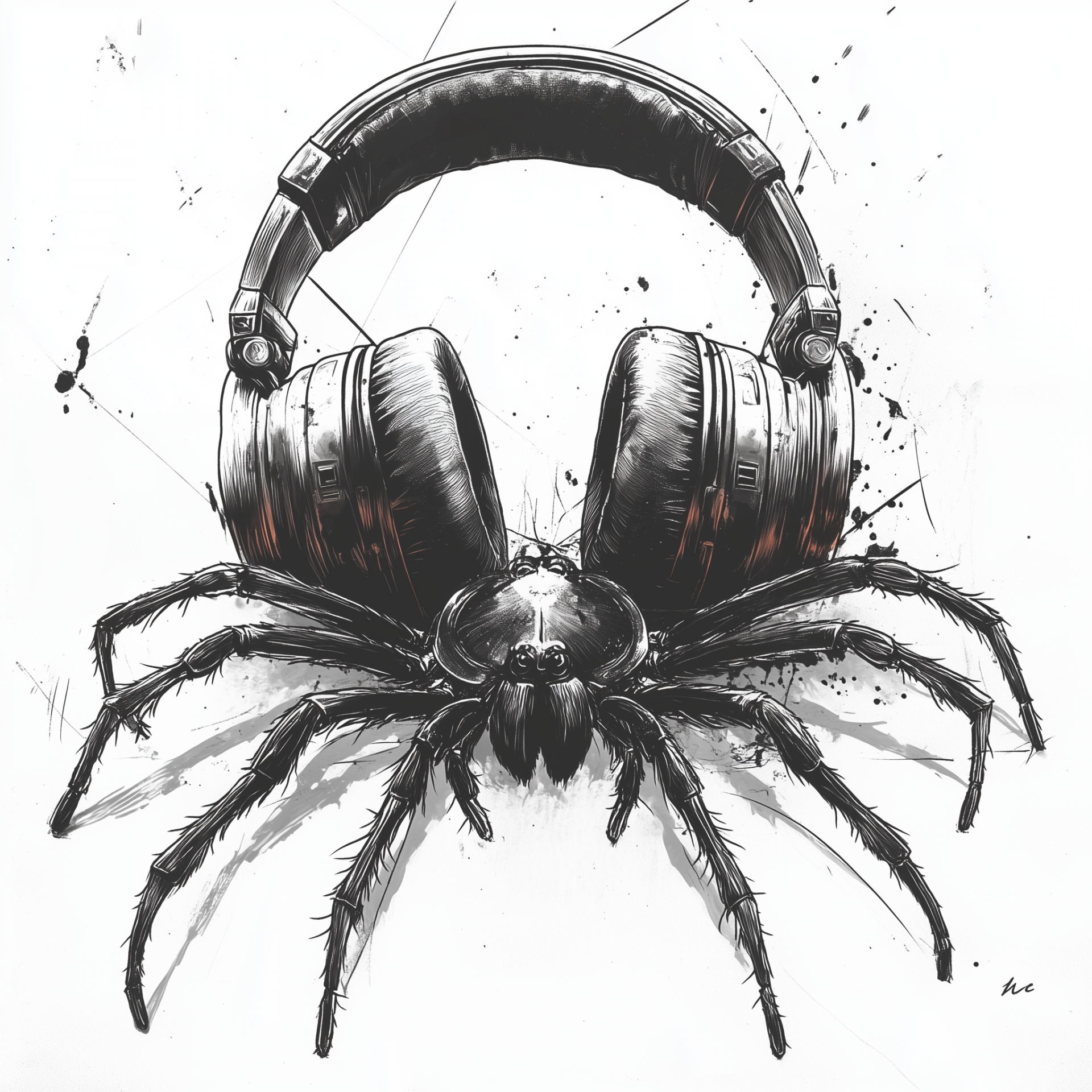 The illustration features a Trinity lookalike character surrounded by realistic vector DJ headphones, with a striking black and white retro style. An intriguing black spider adds a unique touch to the composition, enhancing the overall edgy feel of the artwork.