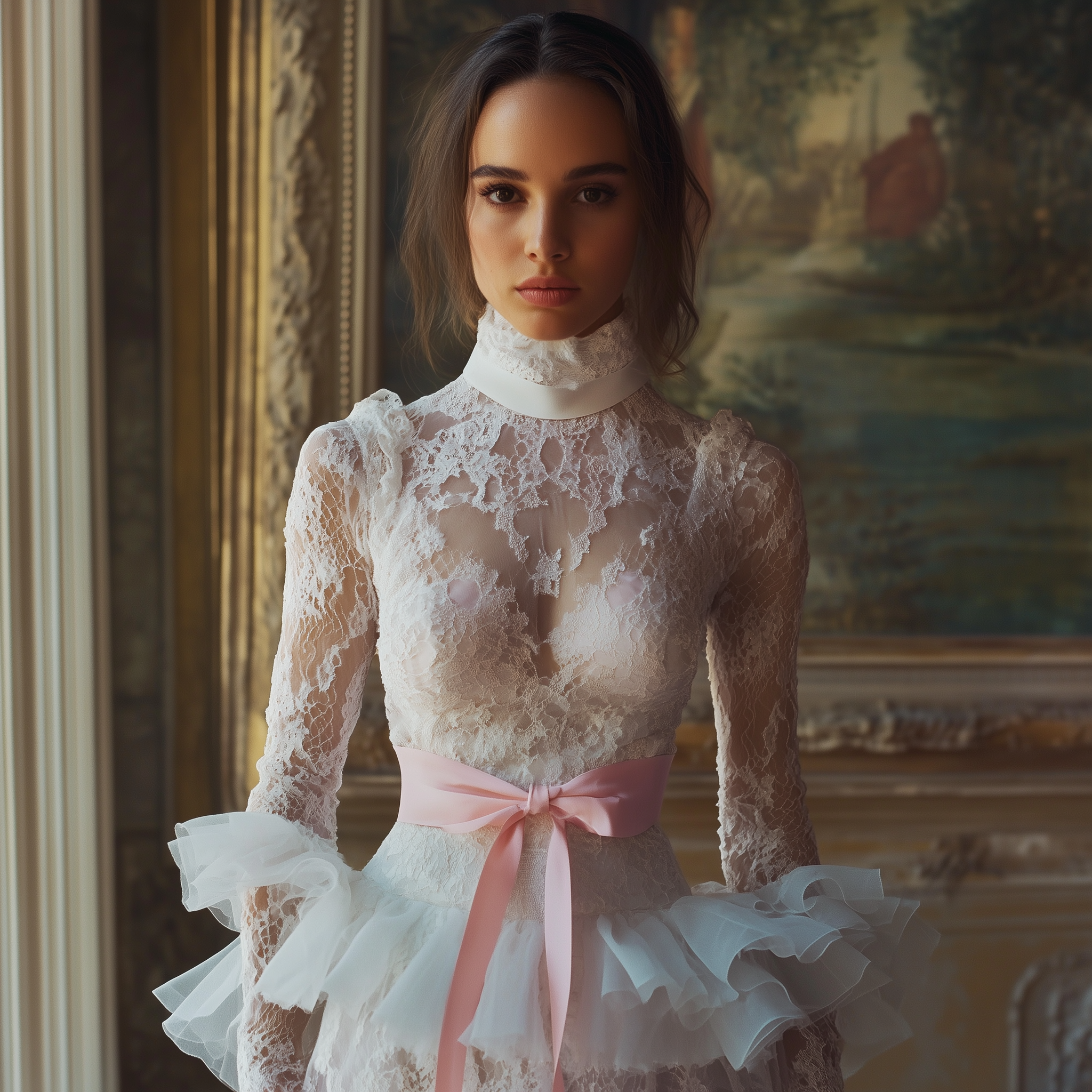 The image presents a stunning fashion moment set in an opulent French Rococo salon. The model showcases a beautifully detailed lace dress that exudes elegance and sophistication, capturing the charm of luxury fashion.