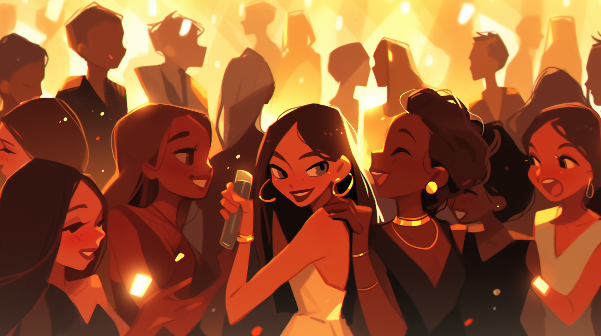 This image captures a vibrant scene of a group of elegantly dressed women enjoying a lavish party in a stunning chateau. The mix of cartoon and real-world elements creates a unique and striking visual experience, filled with bold colors and intricate details.