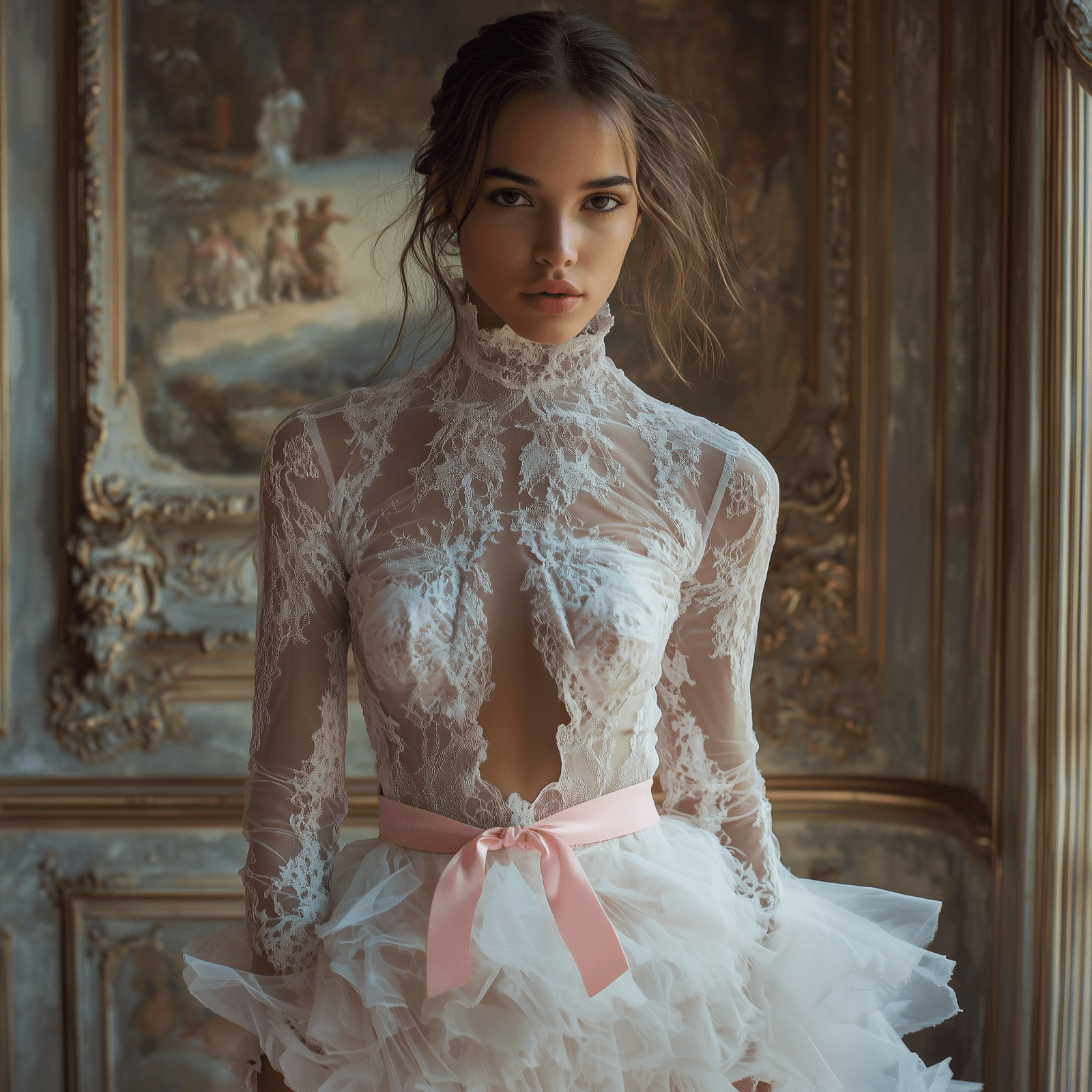 The image features a stunning fashion photograph set in a lavish Rococo-inspired salon. The intricate lace details and soft pink accents of the dress create a luxurious and dreamy atmosphere.