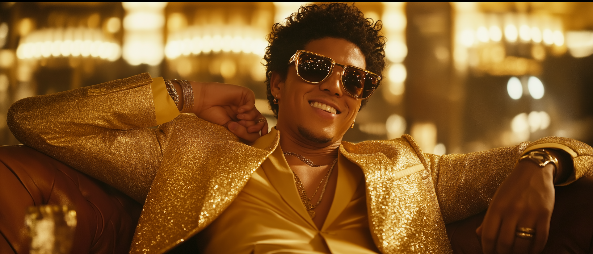 The image captures a glamorous scene from a hidden perspective, portraying elegant arms adorned with gold jewelry and a shimmering jacket. The warm glow of lights and high contrast create an inviting cinematic atmosphere, reminiscent of luxury moments.