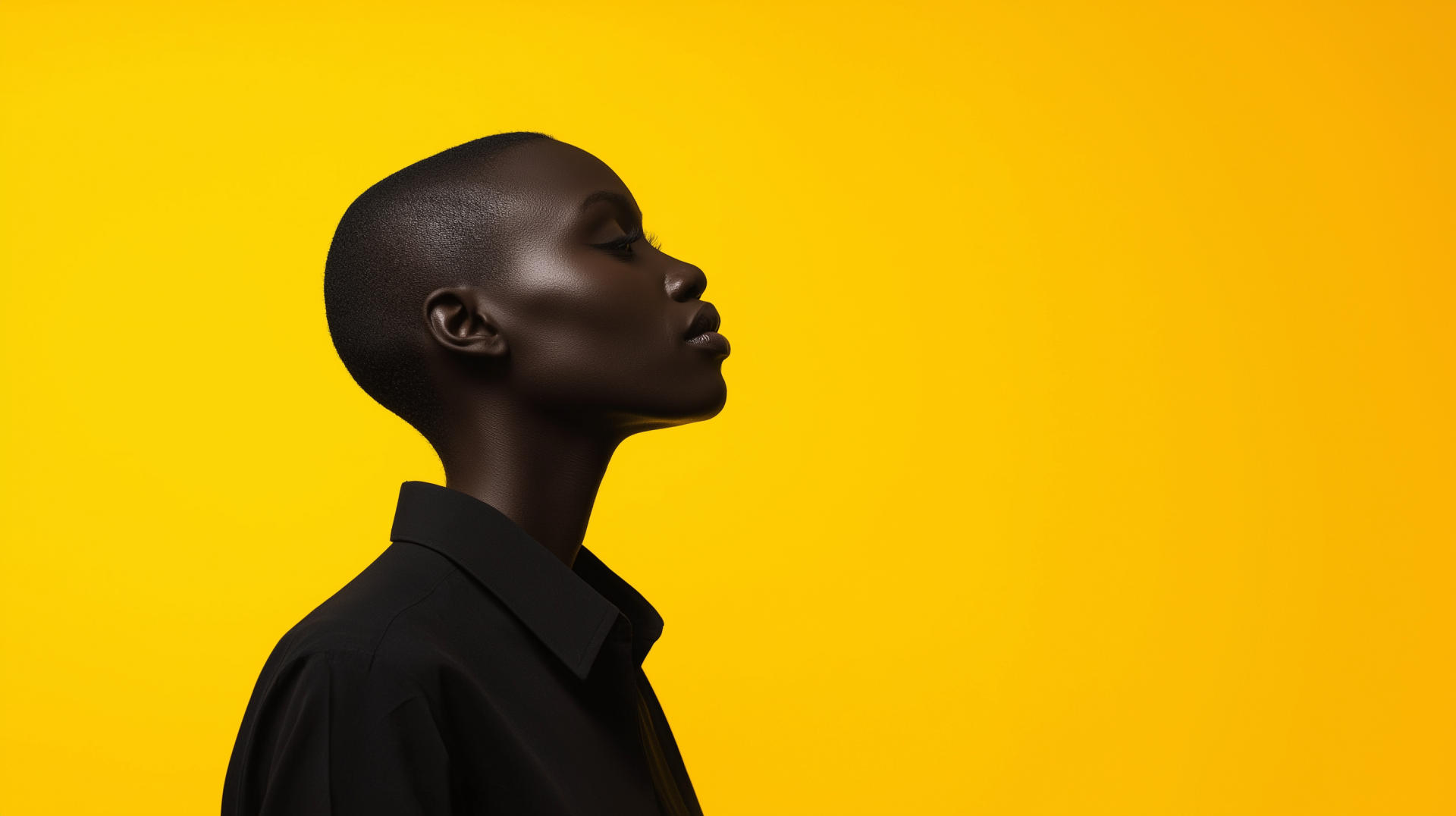 The image features a striking full-body portrait of a black fashion model set against a bright yellow backdrop. The clean composition and studio lighting create a vibrant, high-resolution look with minimal shadows.