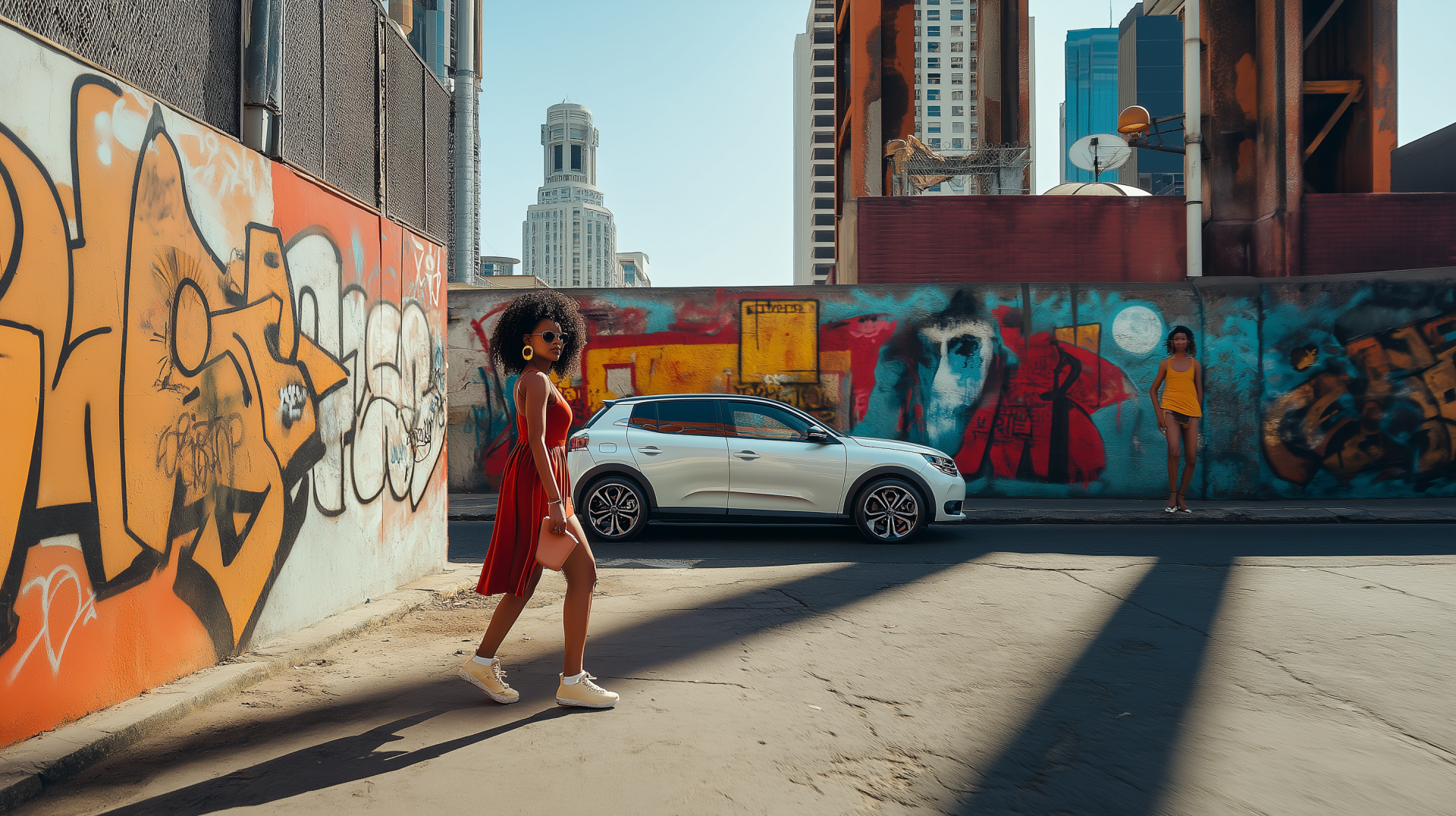 A fashionable black woman confidently strolls beside a pristine white Citroen C3 in the vibrant streets of Maboneng, Johannesburg. The image captures the essence of urban life during daylight, showcasing premium photo quality and stunning realism.