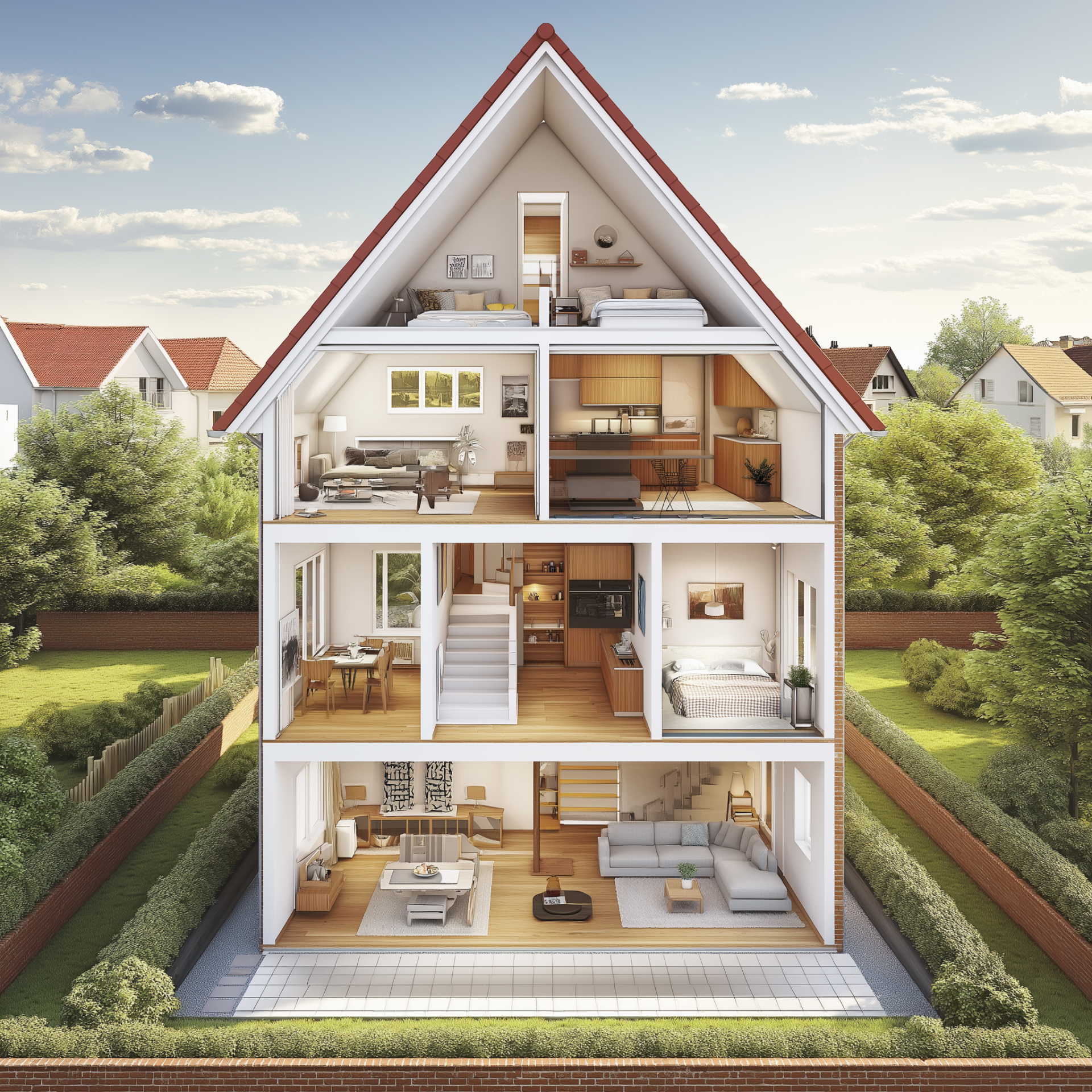This photo realistic cross section showcases a detailed view of a house, highlighting various rooms such as a living room, kitchen, bedroom, and bathroom. The house features a pitched roof and is set against a serene suburban backdrop.