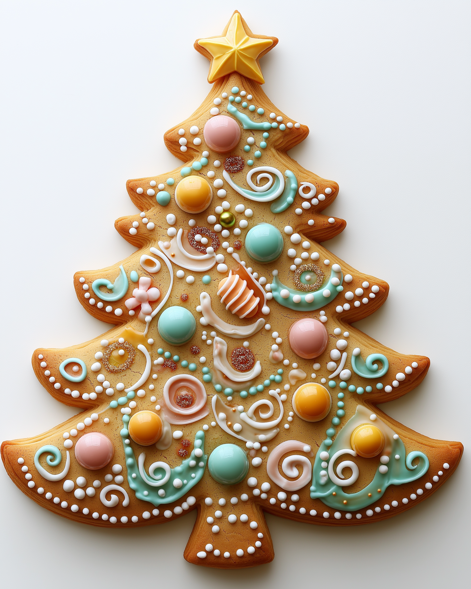 The image features a stunningly decorated cookie in the shape of a Christmas tree. It showcases vibrant ornaments made of icing and candy, illuminated by soft natural light against a clean white background.