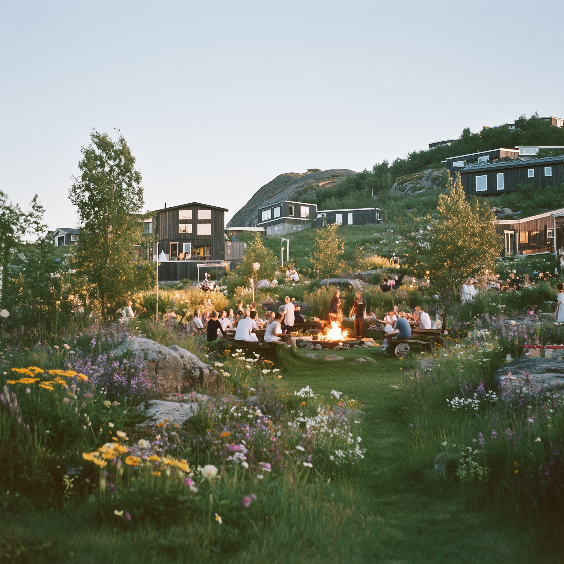 The image captures a vibrant summer scene filled with blooming flowers and green landscapes. A diverse group of people from various ages are joyfully celebrating around a bonfire, exuding a lively and communal atmosphere.