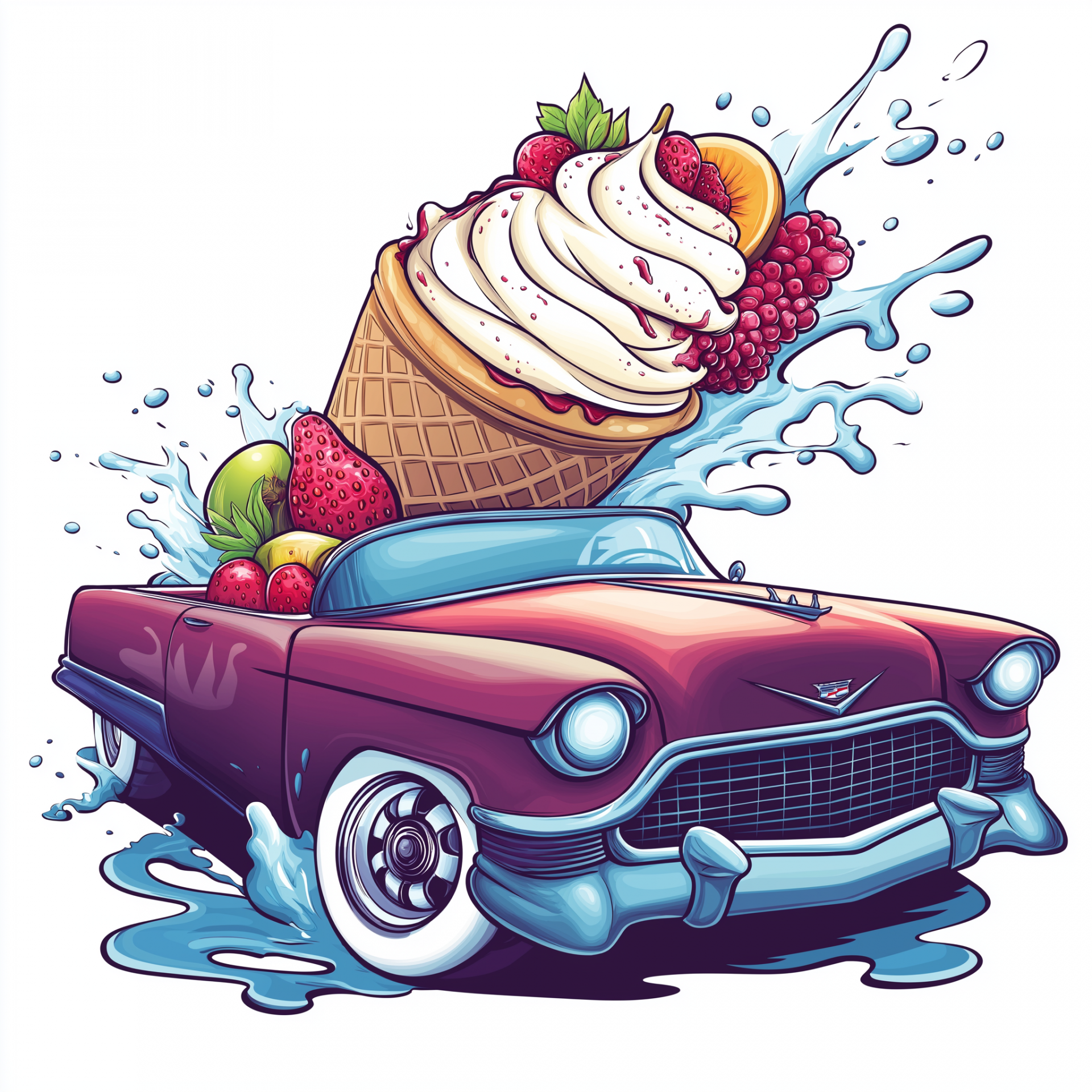 This colorful illustration features a whimsical ice cream sundae driving a vintage 50s Cadillac convertible. The thick black outlines and comic style create a playful vibe, with ice cream and fruit splashing out as if caught in the wind.