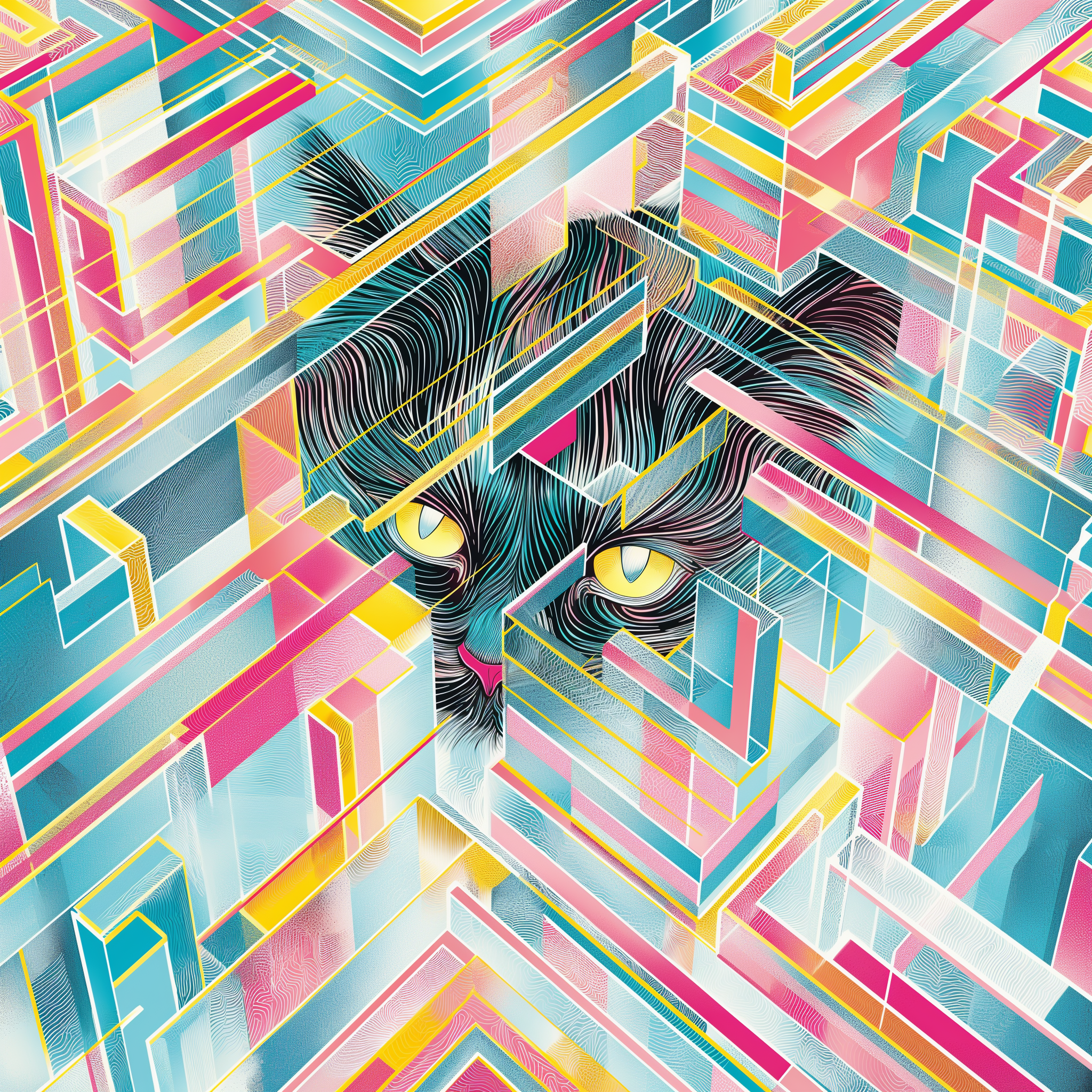 This image features a pixel art icon of a black cat head created using simple shapes, with striking yellow eyes. The design is symmetrical and reminiscent of vector illustration, giving it a clean and modern aesthetic. The background is a colorful pattern with neon zigzags, adding a vibrant and dynamic touch to the overall composition.