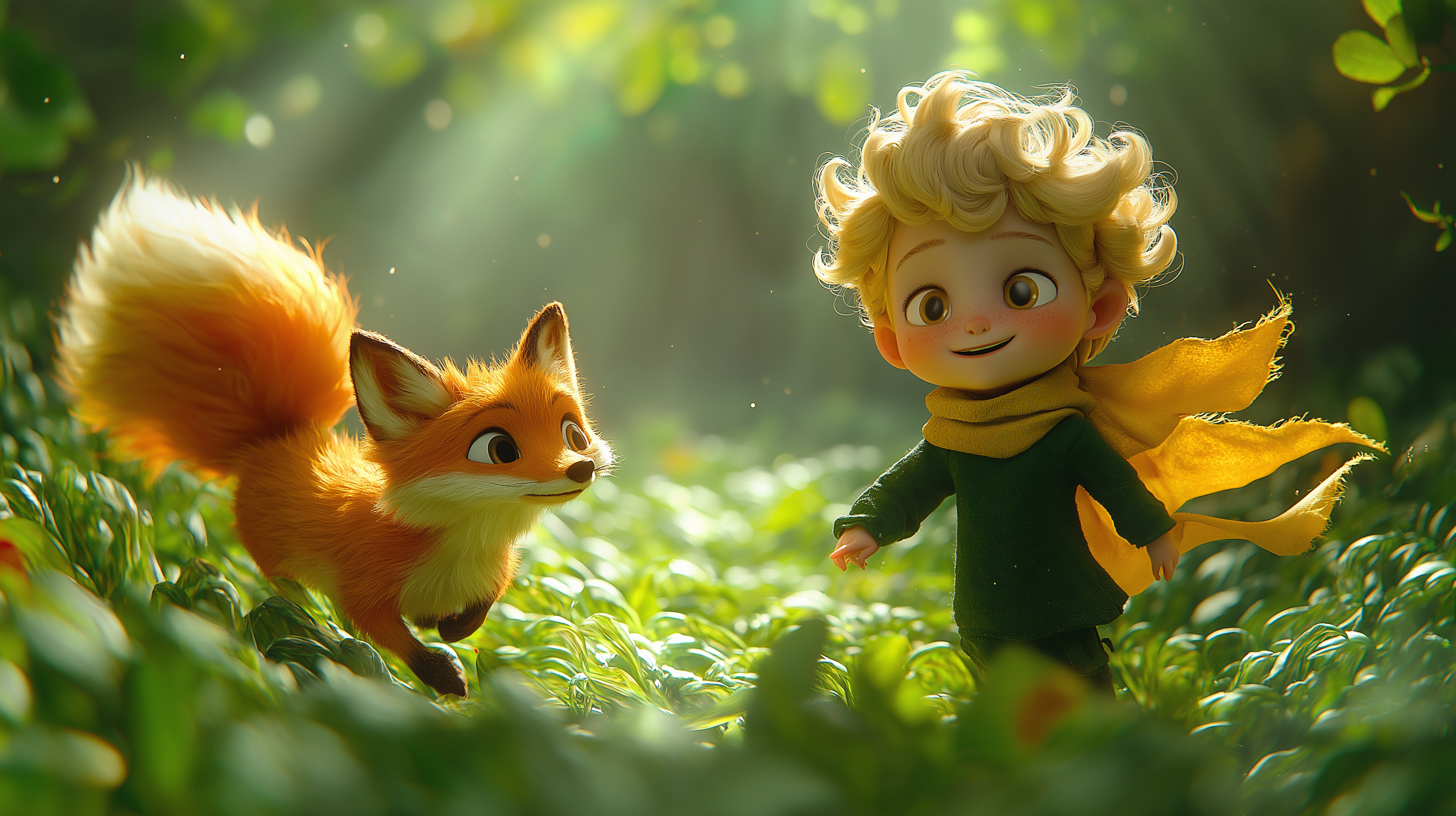 This image captures a joyful moment in a grassy field, with two characters illuminated by soft sunlight breaking through clouds. The vibrant colors and magical atmosphere evoke a sense of innocence and friendship.