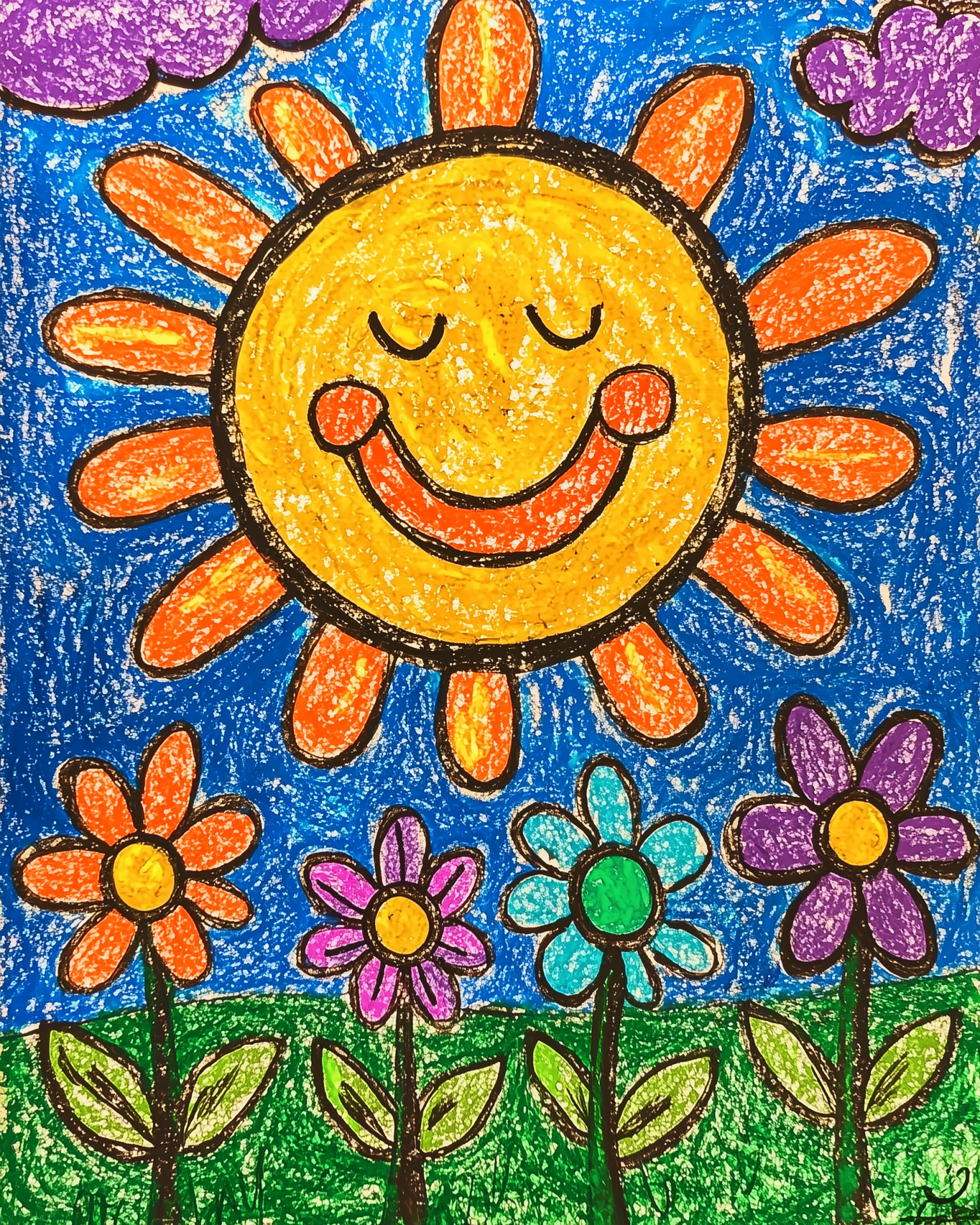 This image features a colorful children's drawing depicting a bright sunny day. The artwork showcases a big smiling sun, fluffy clouds, and playful flowers and trees, all rendered in vibrant pastel colors with a crayon texture.
