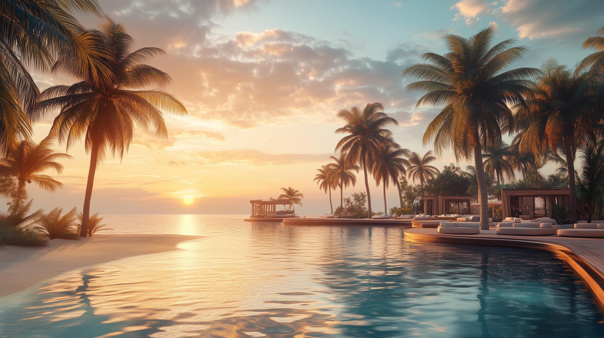 The image depicts a serene tropical beach with swaying palm trees and crystal clear sea waters. Sunlight glistens on the sand, creating a warm and inviting atmosphere perfect for relaxation.