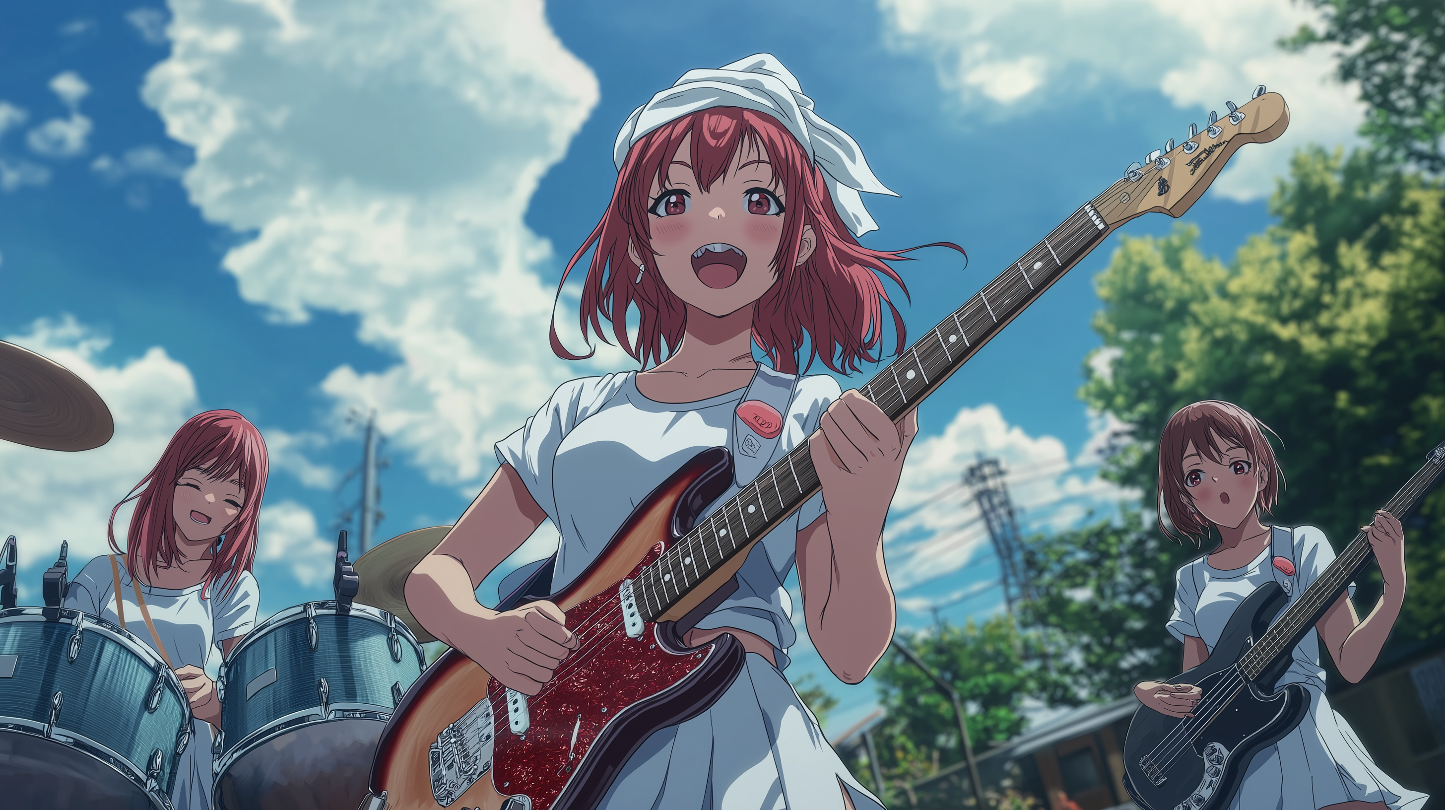 The image depicts a cheerful and vibrant scene with a four-member girl band enjoying a sunny day. The girls, dressed in elegant white dresses, showcase their instruments and convey a sense of joy and creativity through their animated expressions.
