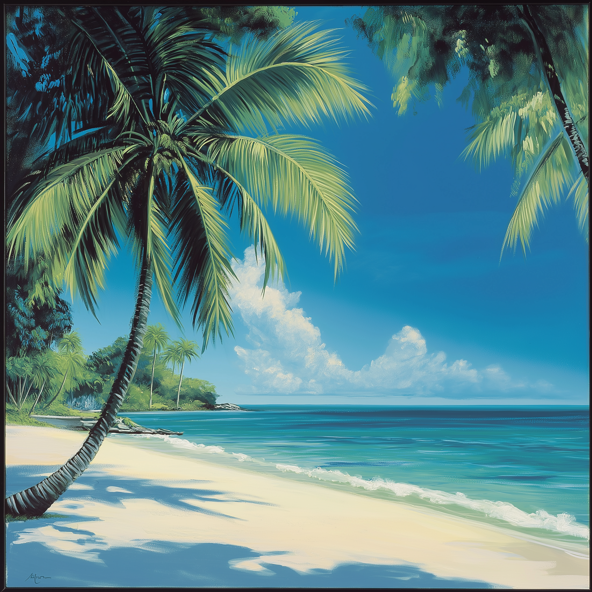 A serene tropical beach with clear blue skies and turquoise water. Lush palm trees cast dappled shadows on the pristine white sand, creating a perfect paradise.