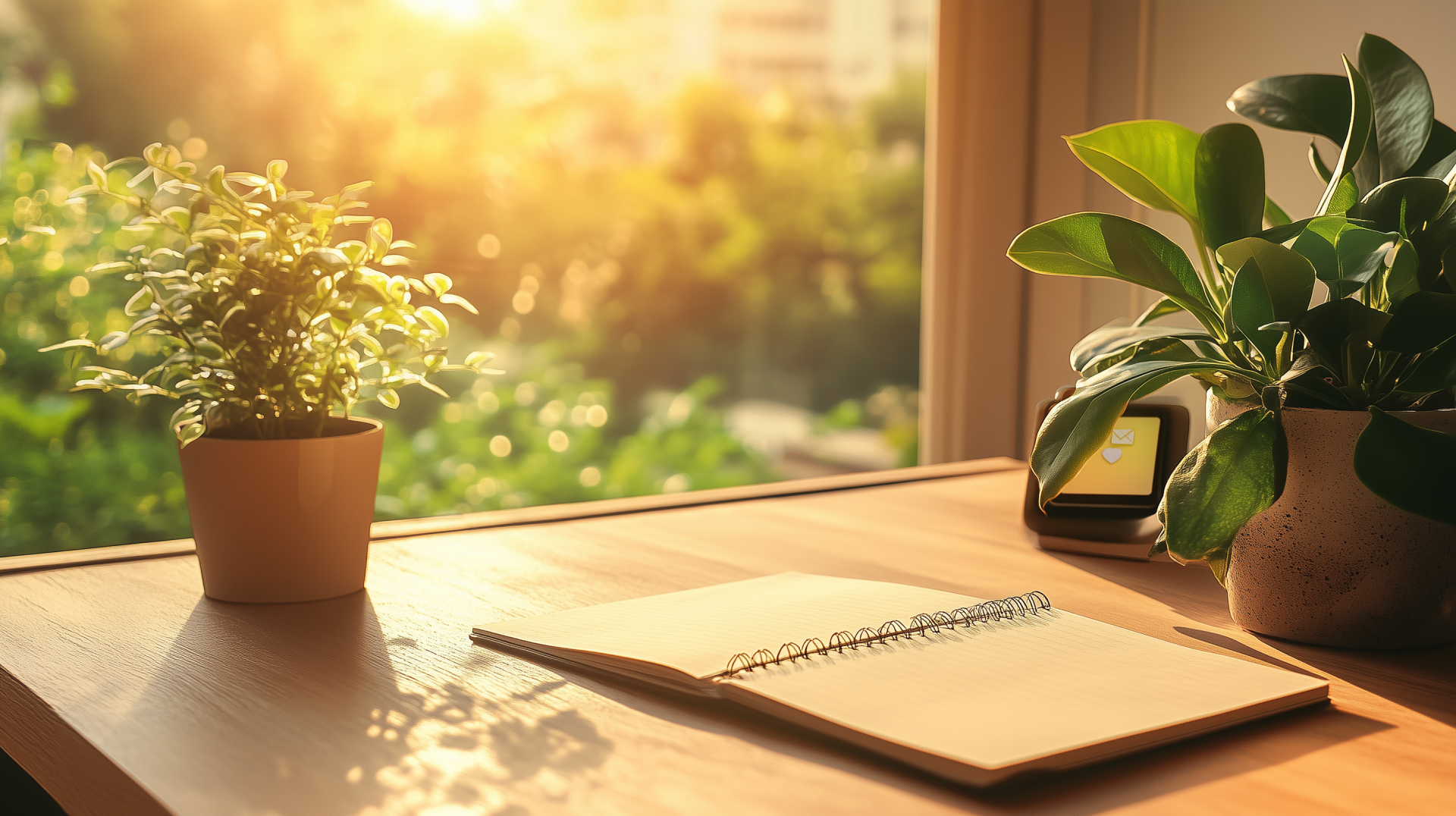 The image features a sunlit desk adorned with a fresh notebook and vibrant plant leaves that reflect the light. It captures a warm and inviting atmosphere, symbolizing new beginnings and creativity.