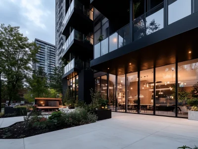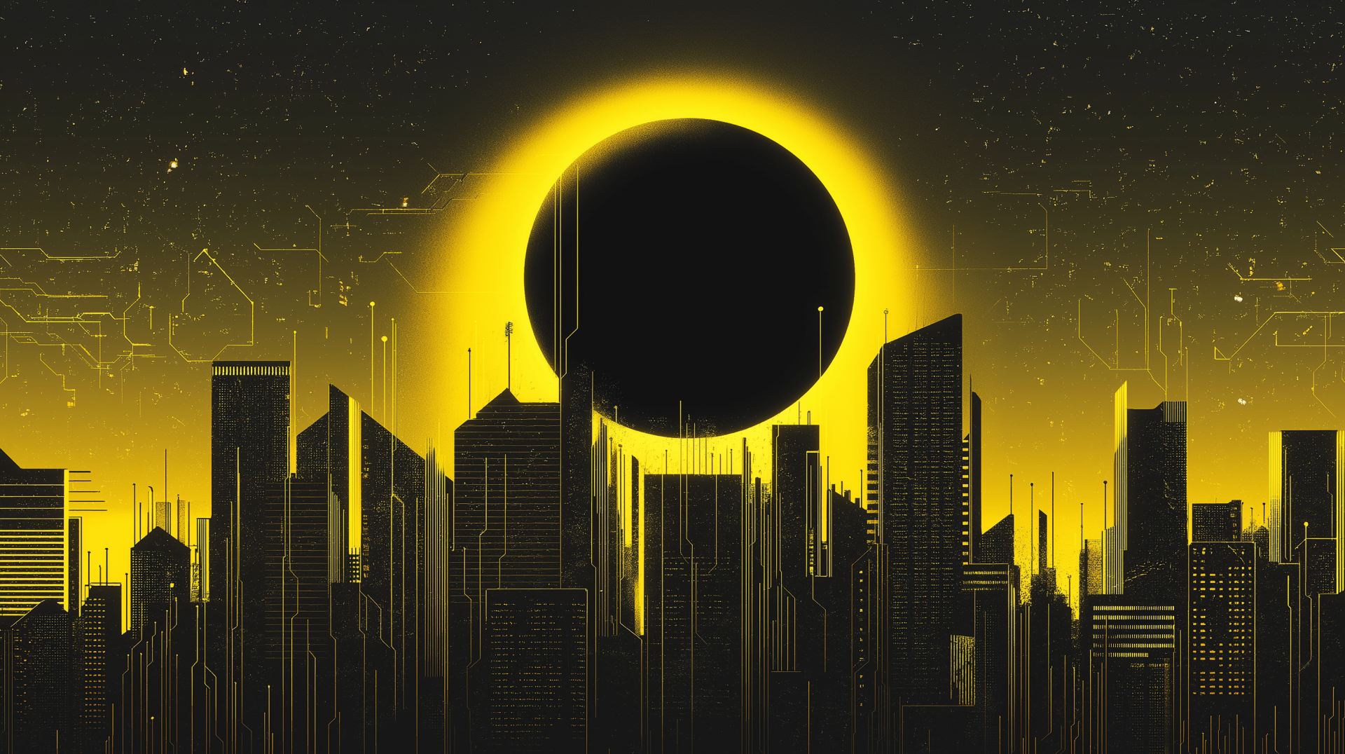 This illustration features a high contrast city skyline set against a striking yellow color scheme. The geometric shapes create a sense of depth with a bold and abstract flat sky in the background.