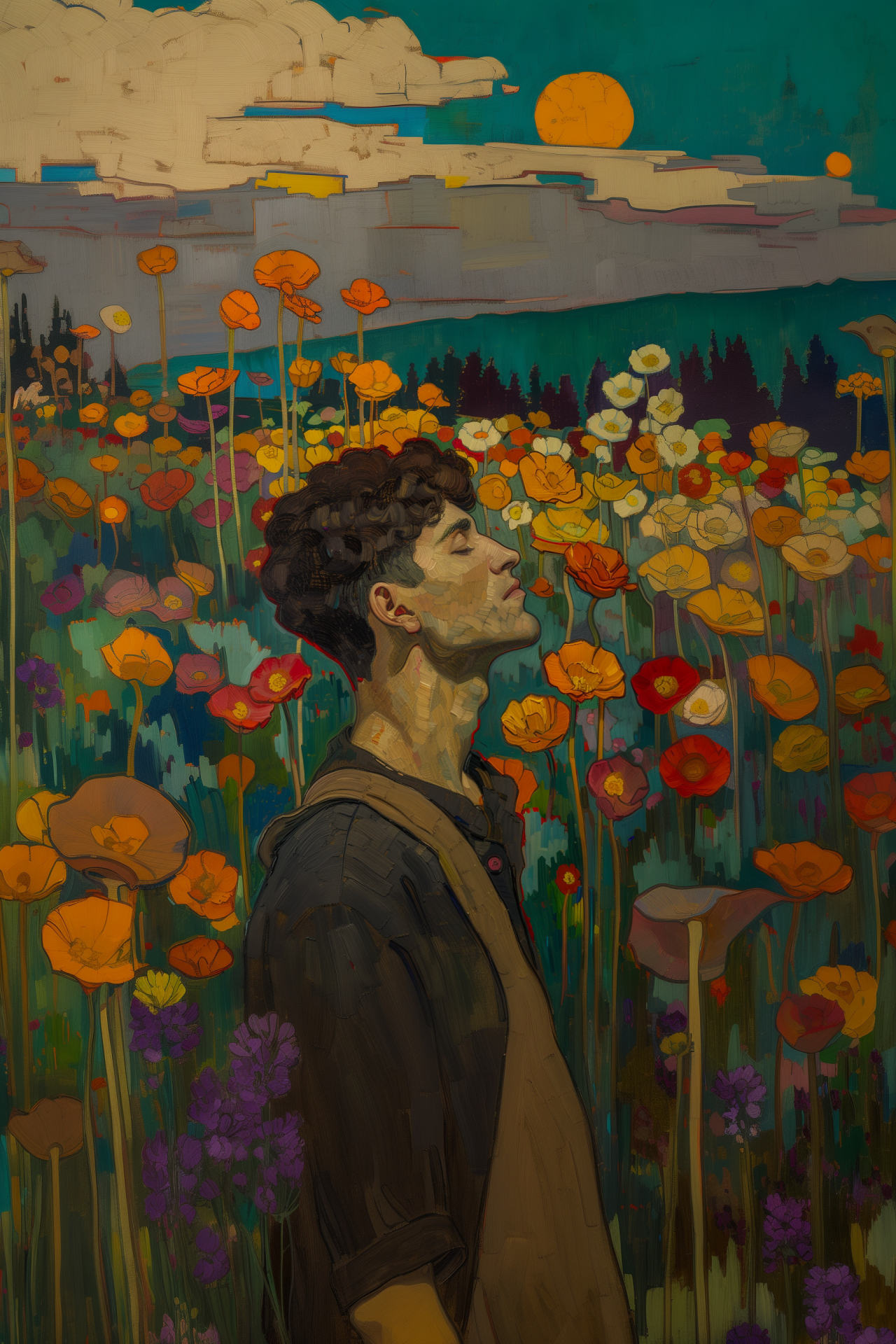 The painting depicts a man with flowing forms and vibrant colors, evoking a dreamlike quality. The visible brushstrokes create a sense of movement and fluidity, while the ultraviolet hues enhance the otherworldly feel.