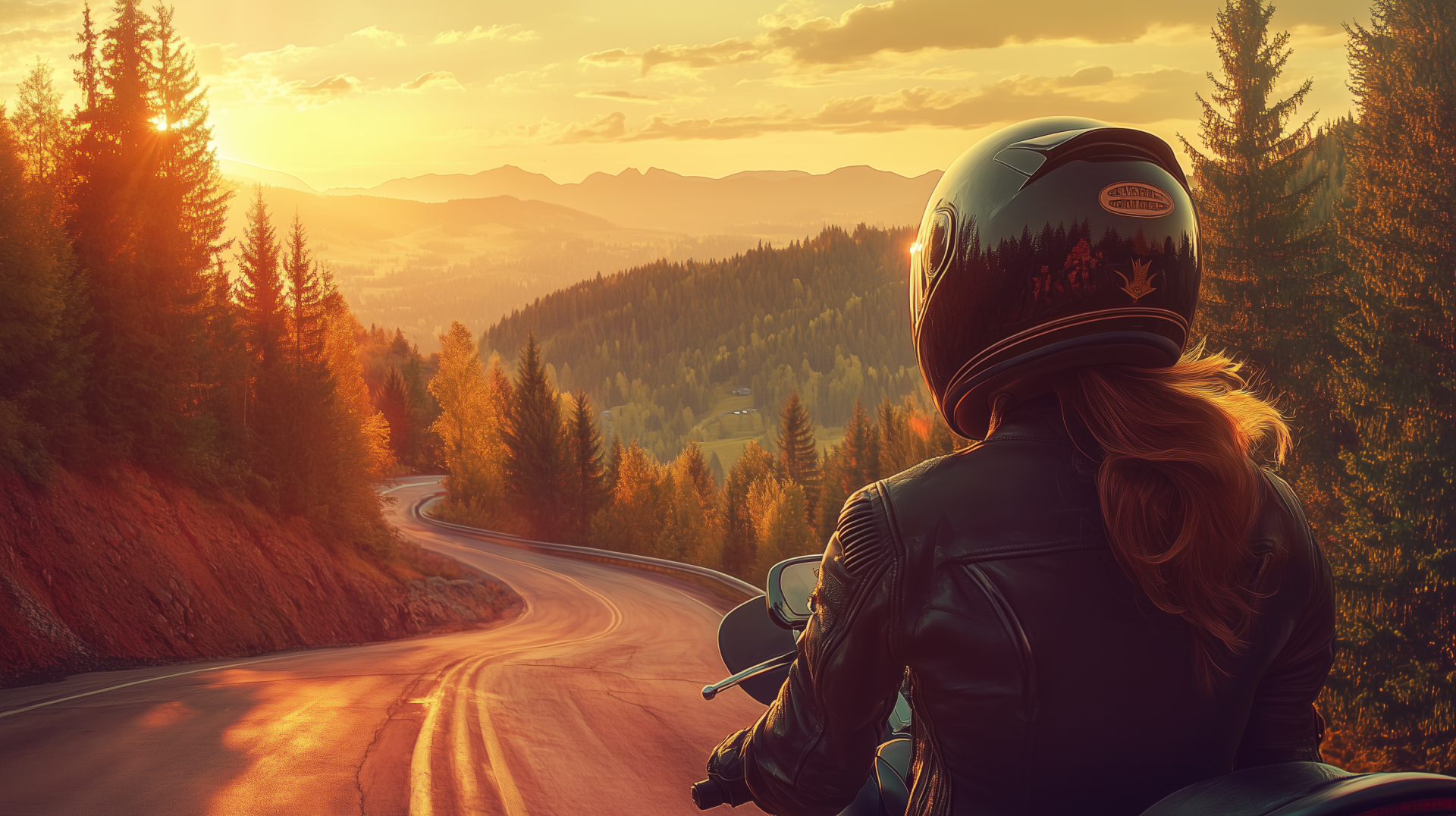 A female motorcycle rider with brown hair is visible on a winding road within a mountainous landscape. The scene captures the rider's side profile in front of a breathtaking golden sunset, surrounded by lush green trees.