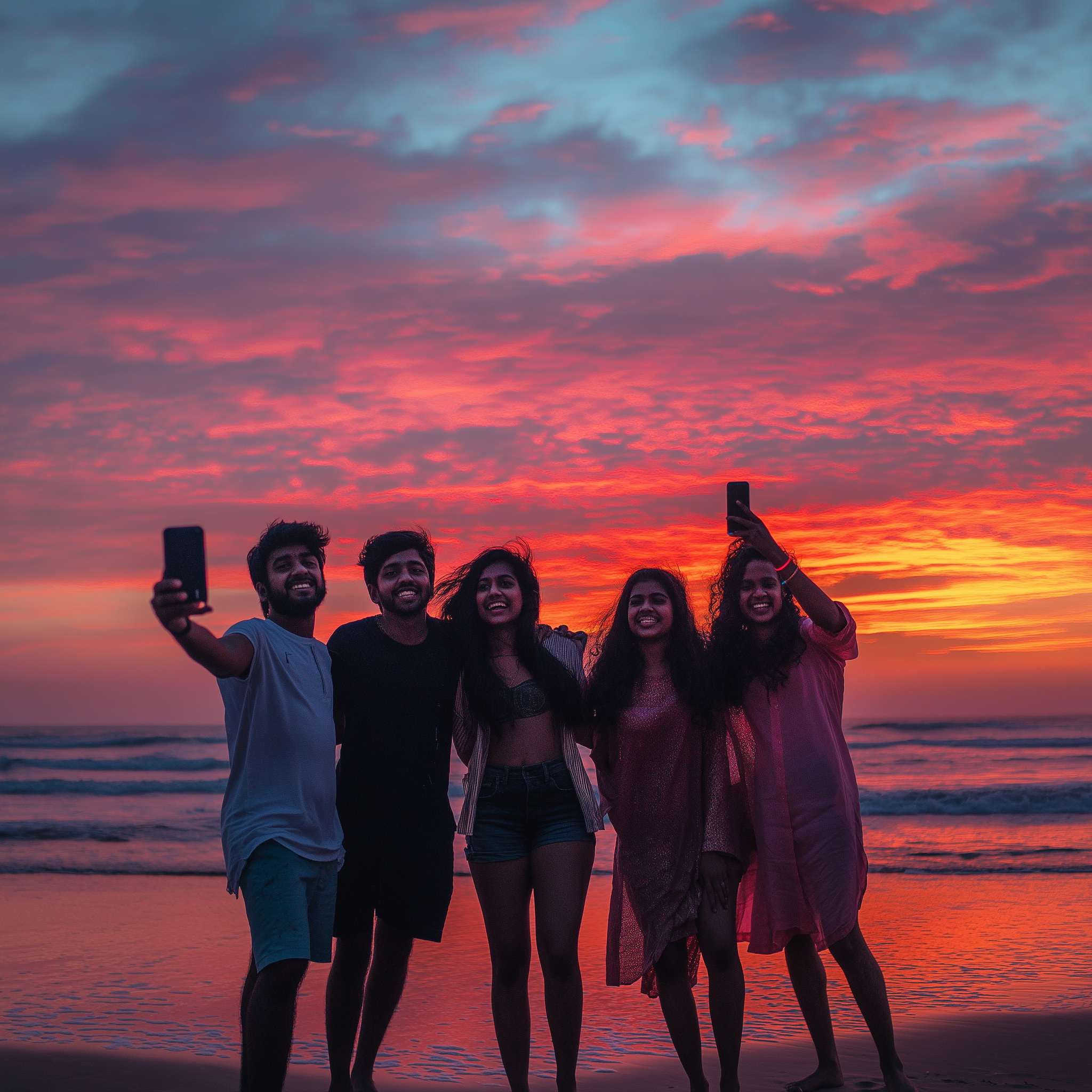 A colorful and vibrant sunset paints the sky in warm hues as a diverse group of young friends, two males and three females, enjoy a fun moment together on the beach, capturing memories with their selfies.