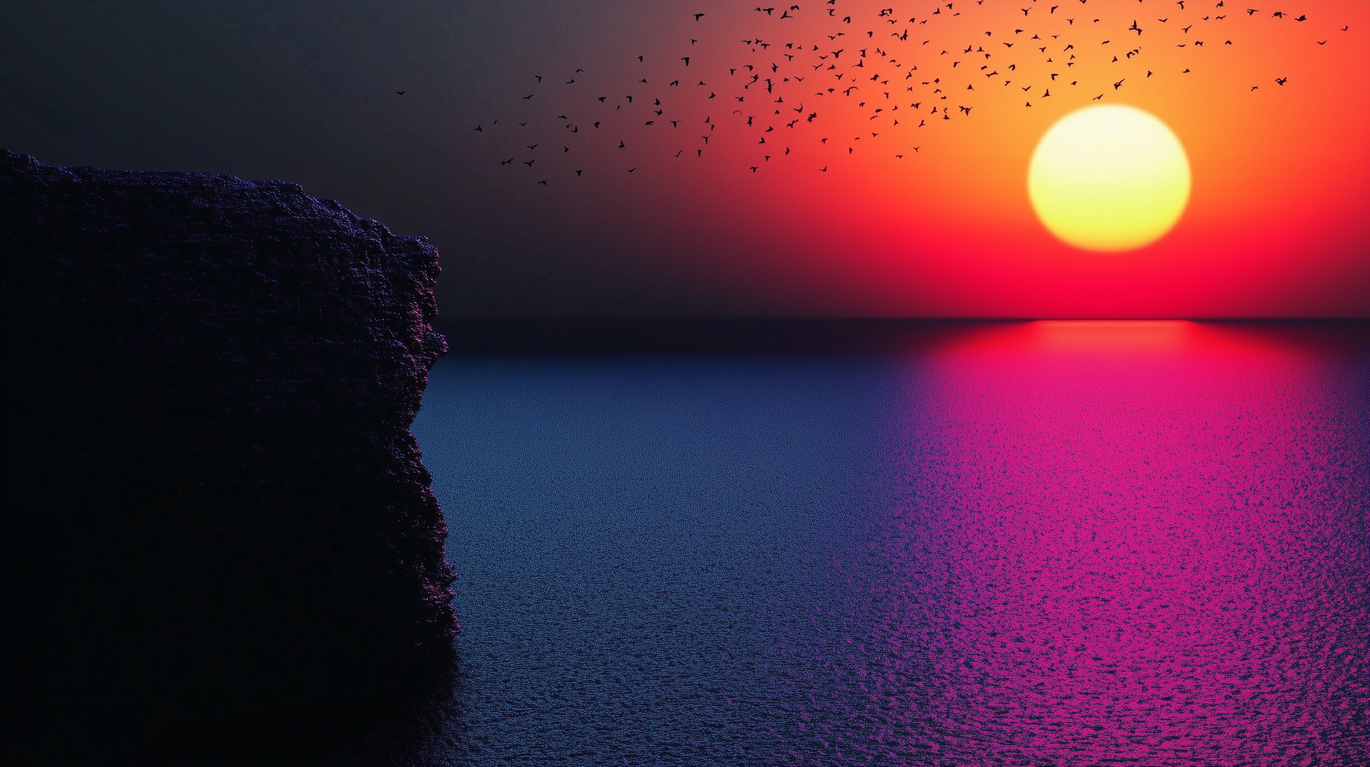 This image captures a beautiful sunset by the shore, with rich hues of orange and pink lighting up the sky. Seagulls can be seen gracefully flying across the horizon, enhancing the tranquil atmosphere of the scene.