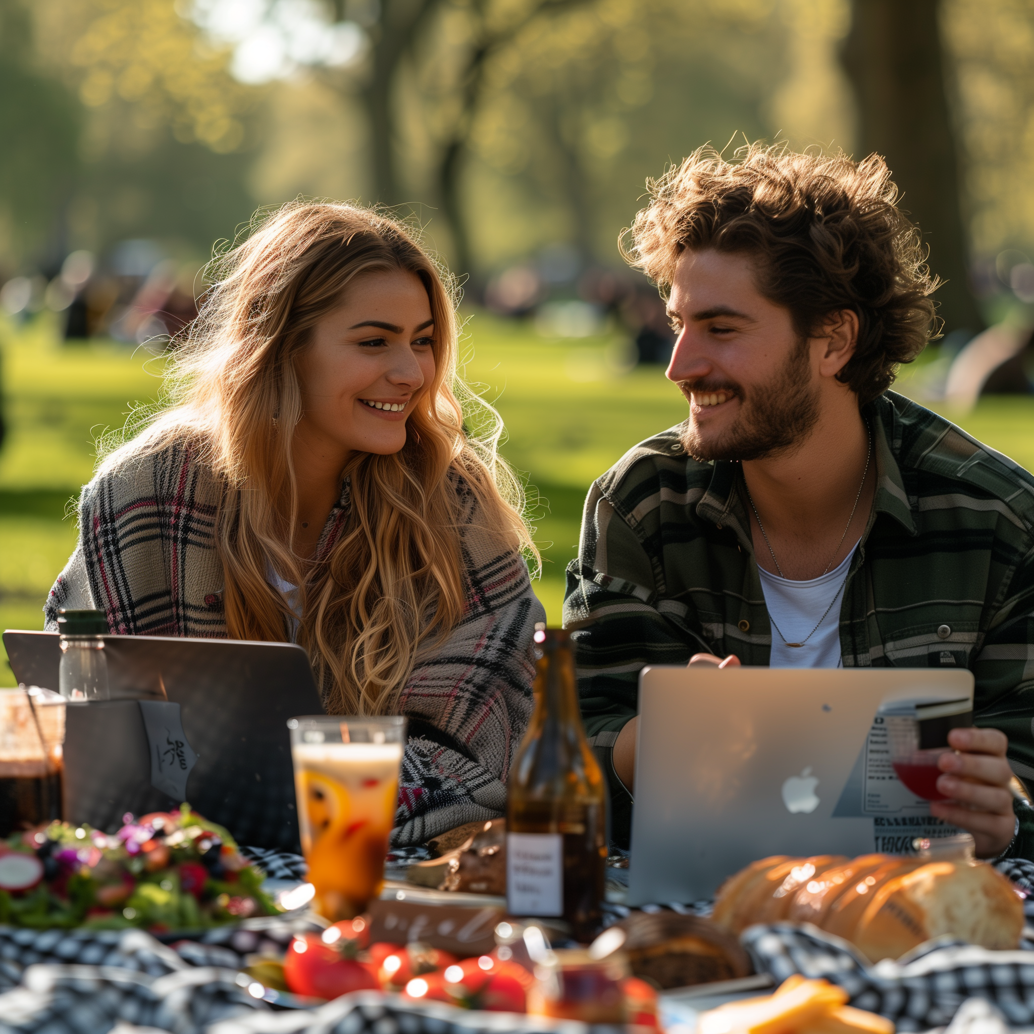 A young couple enjoys a sunny picnic in the park, sharing a laugh over a laptop.