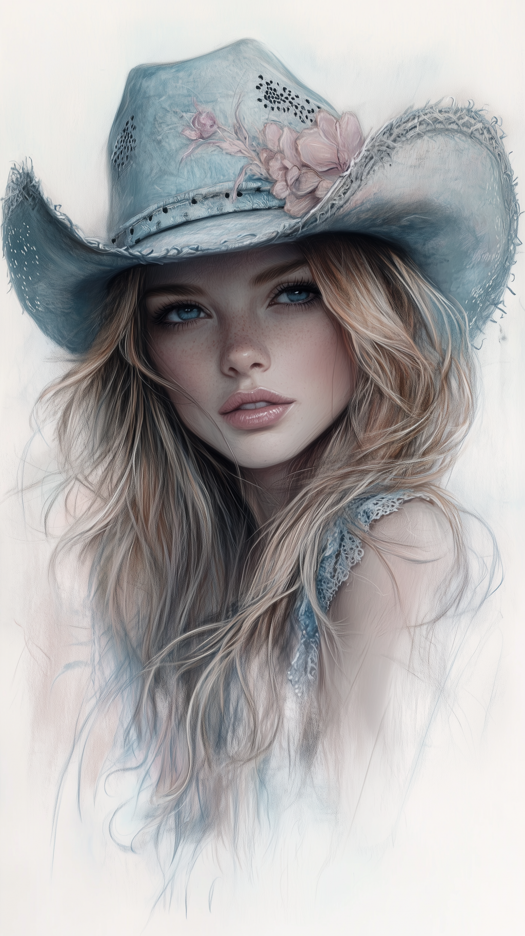 This illustration features a cowgirl wearing a stylish hat, capturing the essence of shabby chic aesthetics. The color palette includes soft pinks and blues, creating a whimsical and charming atmosphere.
