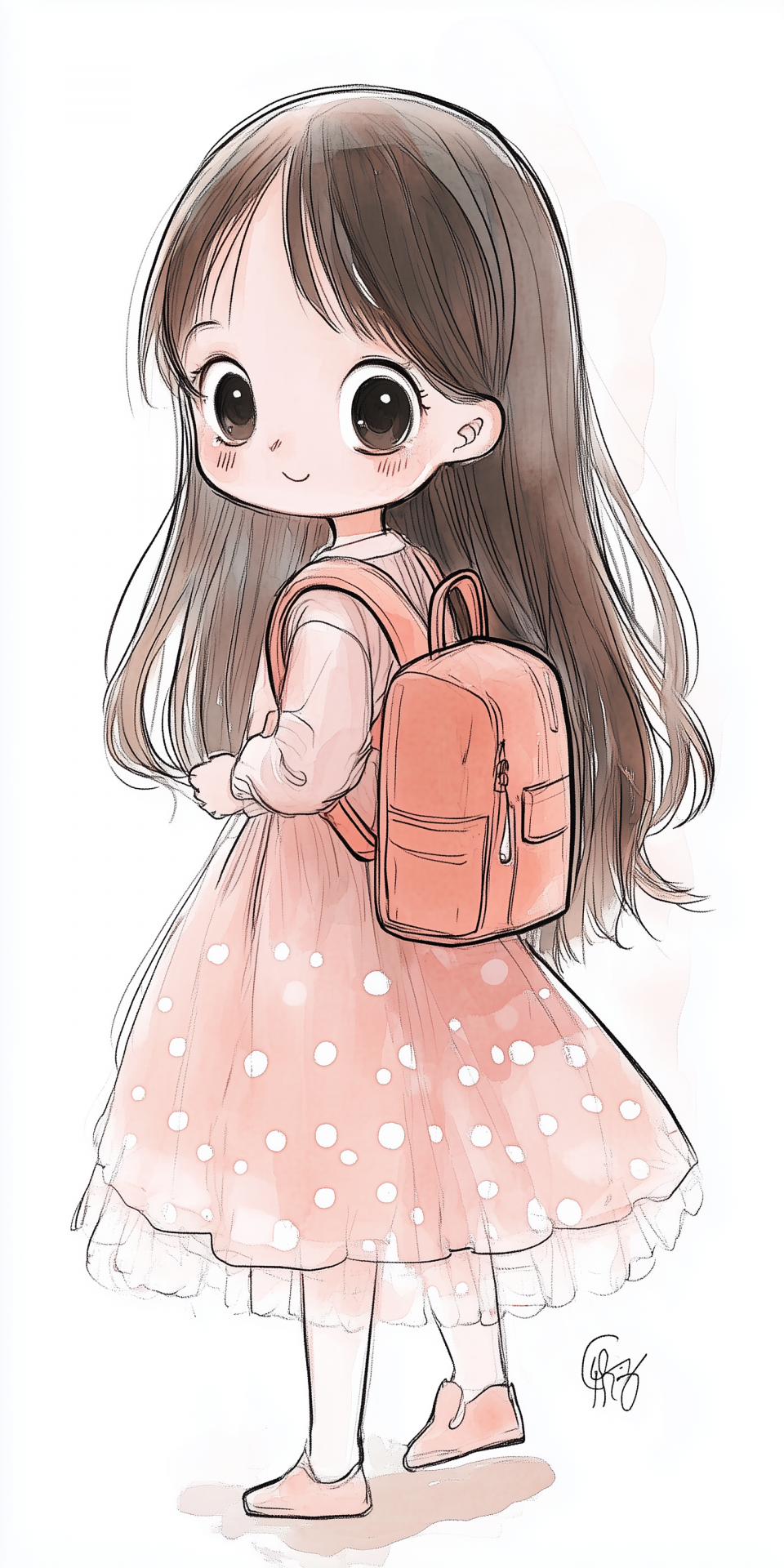 This illustration showcases a cute little girl smiling while wearing an orange backpack. The character features long hair and big eyes, rendered in a charming Japanese anime style against a simple white background.