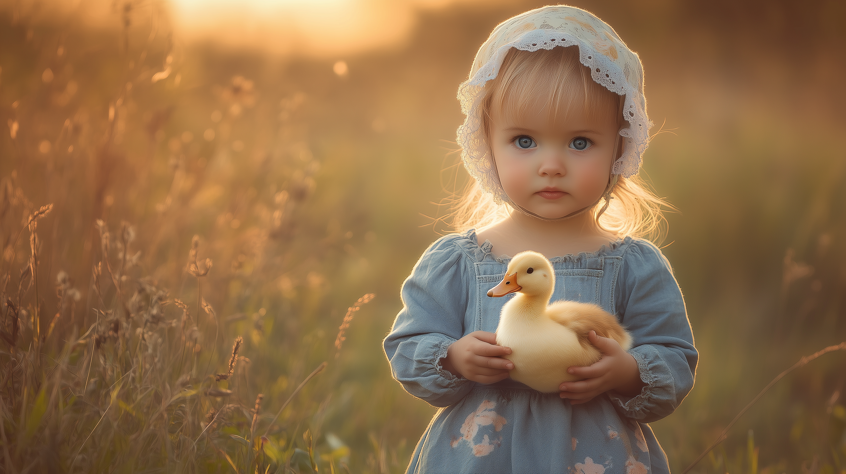 A young girl with blonde hair and blue eyes dressed in vintage dusty blue overalls and a bonnet adorned with flowers, holding a duck in a sunny, grassy field. The image exudes a warm, ethereal glow with the sunlight softly illuminating the scene.