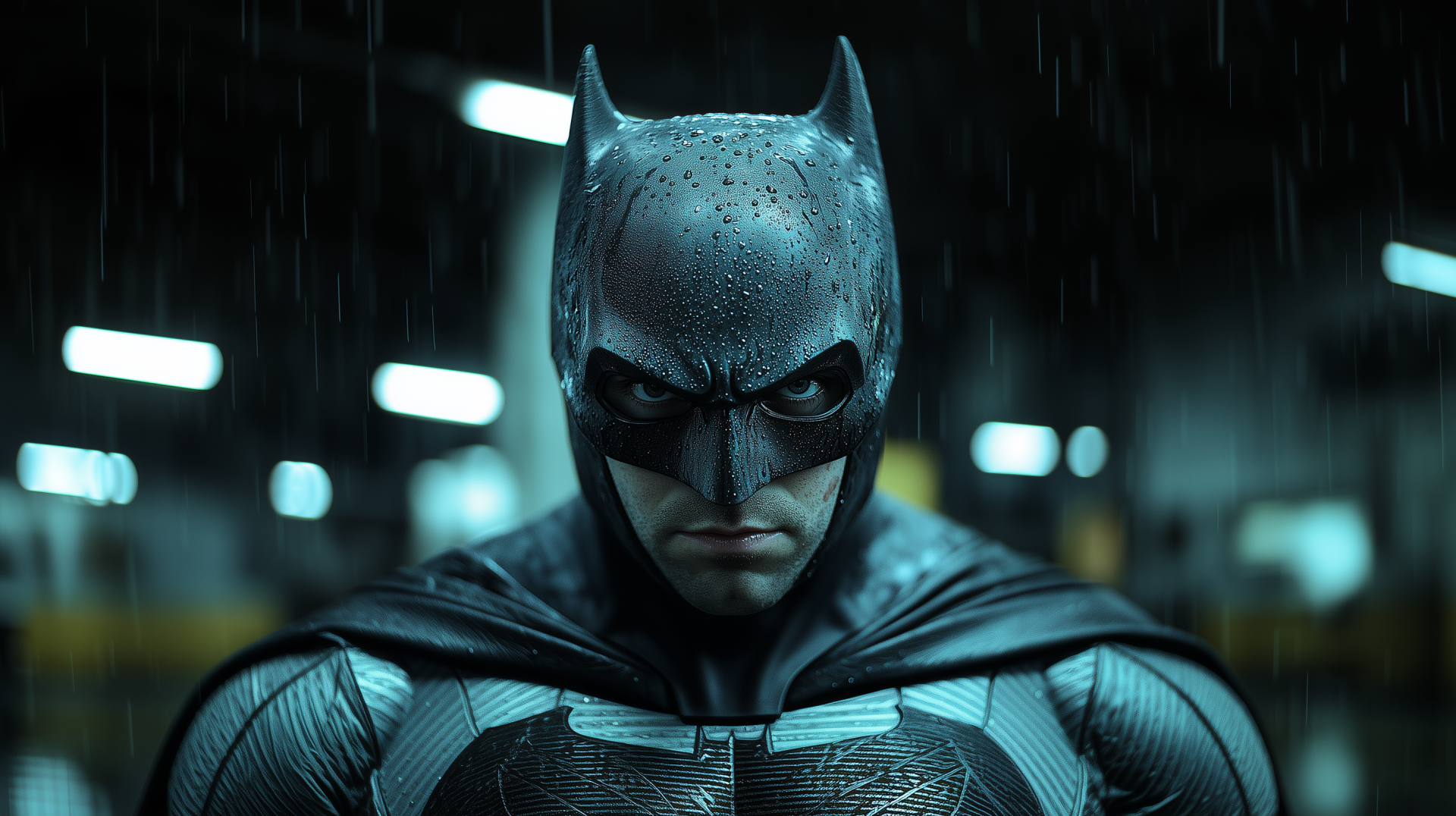 The image captures a detailed view of a Batman helmet, showcasing its sleek design and dark finish. The lighting enhances the textures and contours, giving it a dramatic presence.