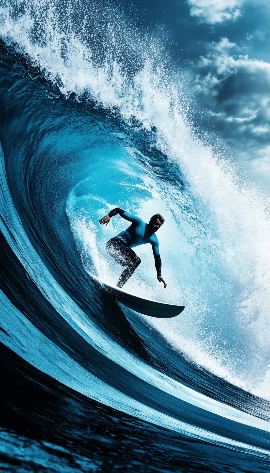 This image captures a confident man on a white surfboard riding a powerful blue wave. The vibrant colors and dynamic motion evoke a sense of freedom and exhilaration.