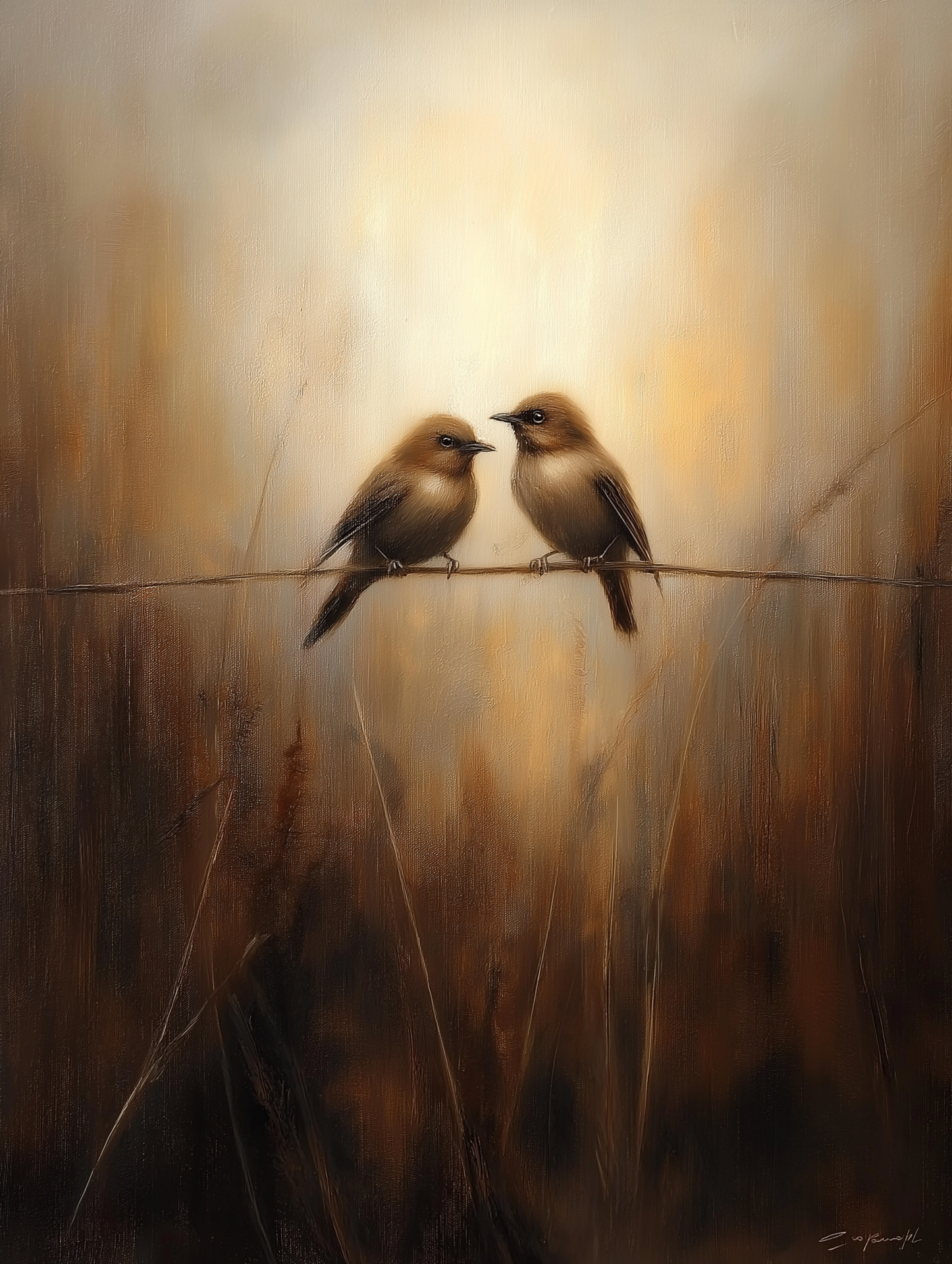 The image features a vivid scene with blackbirds perched on a wire against a bright, sunny backdrop. The style evokes a sense of surrealism, merging everyday life with whimsical elements.