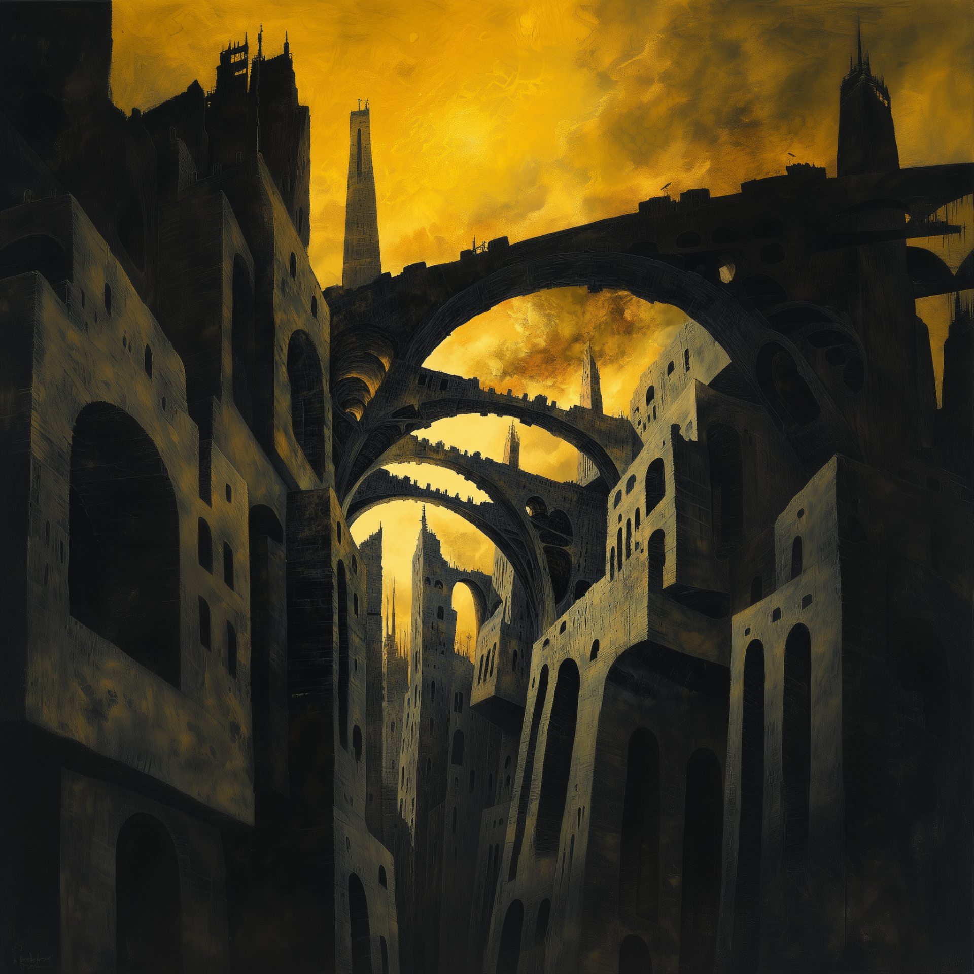 This illustration features a dark surreal cityscape that captivates with its twisting and unnatural architecture. The artwork is infused with an eerie atmosphere, highlighted by a striking yellow hue that contrasts beautifully with the darker elements.