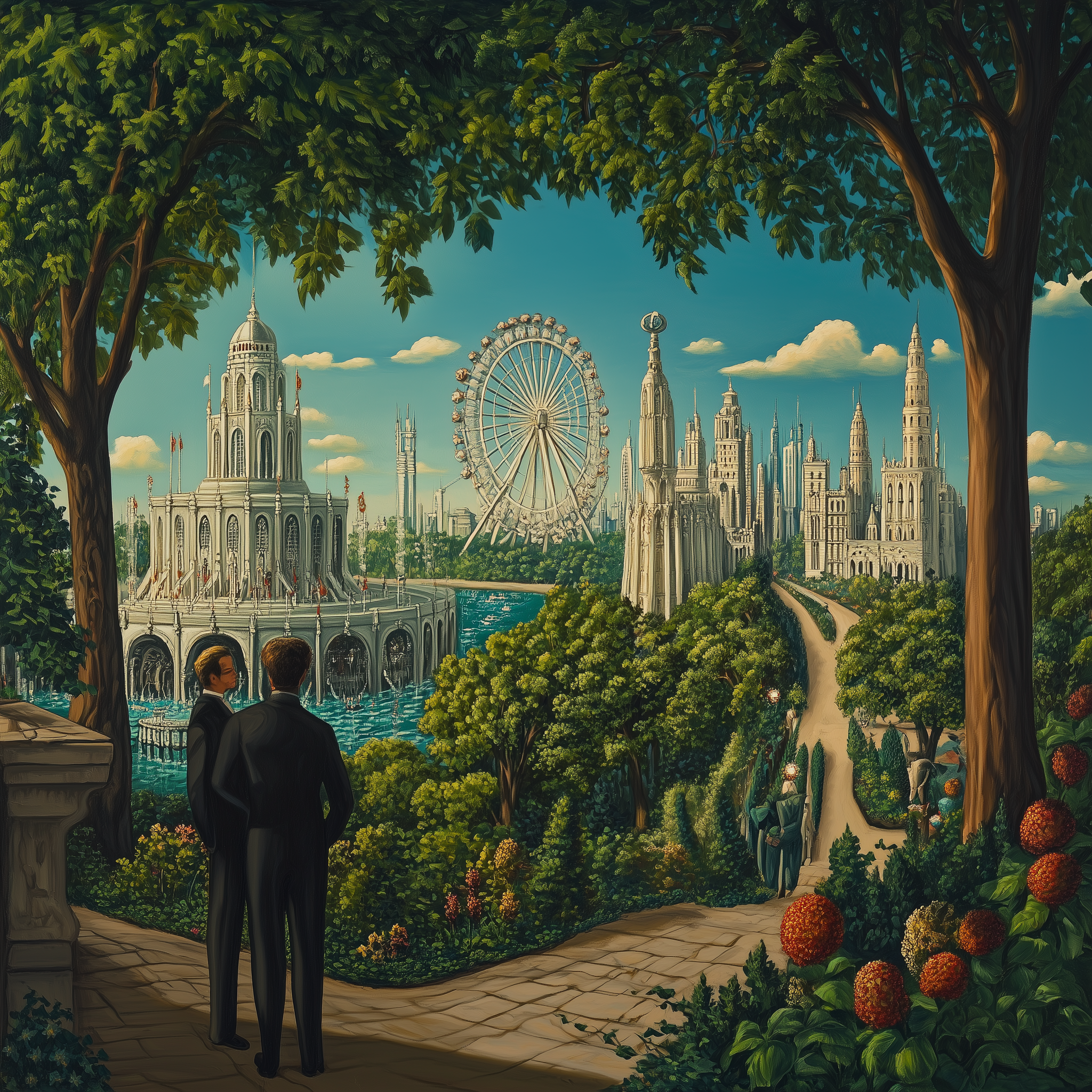 The image presents a surreal landscape filled with bizarre, dreamlike elements common in surrealism. Vivid colors blend with unexpected shapes, inviting the viewer into an imaginative and disorienting world.