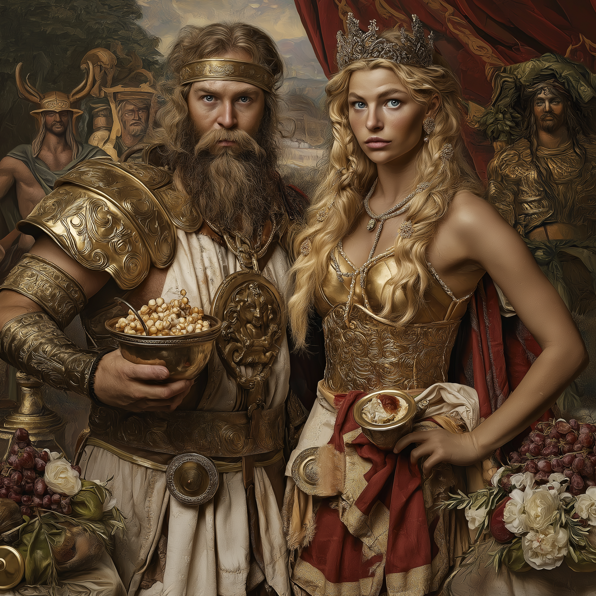 The image showcases a gathering of individuals dressed as Olympian gods, creating an atmosphere of grandeur and celebration. The cozy yet elaborate setting is filled with intricate details, reflecting a sense of upliftment and festivity.