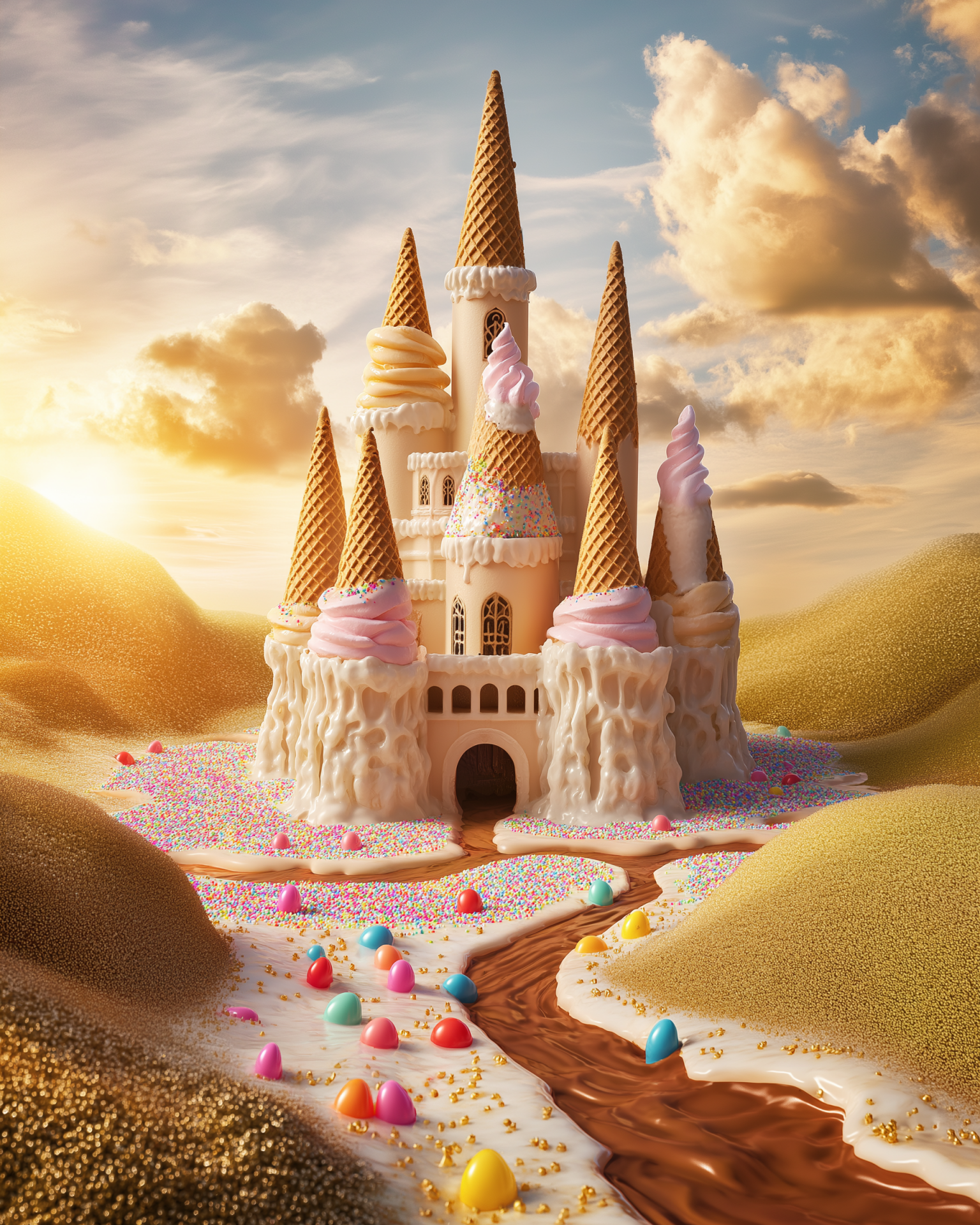 This whimsical scene features a castle constructed entirely of ice cream, with waffle cone spires adorned with colorful sprinkles. The castle is gently melting under the warm golden sunlight, situated in a candy meadow with chocolate rivers and gumdrop paths beneath a dreamy summer sky.