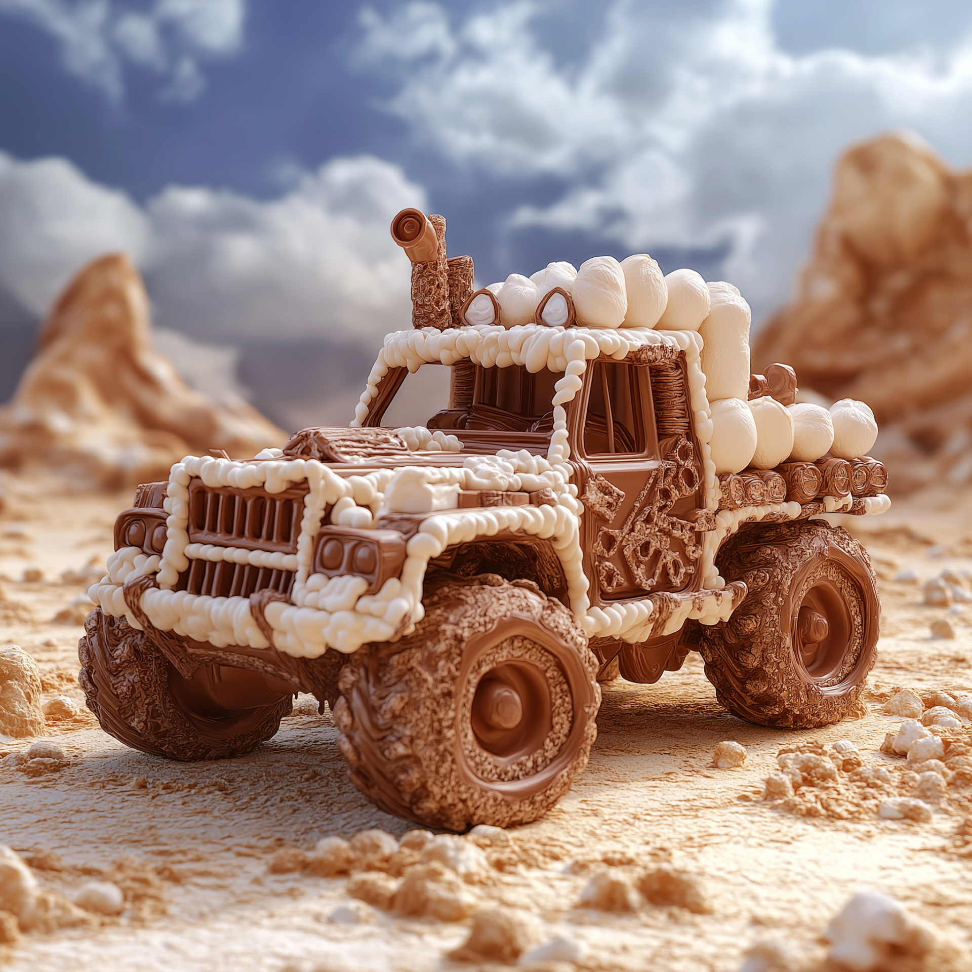 The image showcases a whimsical 3D animation of a truck designed in a Mad Max style, made completely out of fluffy marshmallow cookie dough and chocolate. Its bright colors and cartoonish features evoke a playful Pixar aesthetic, making it look both delicious and adventurous.