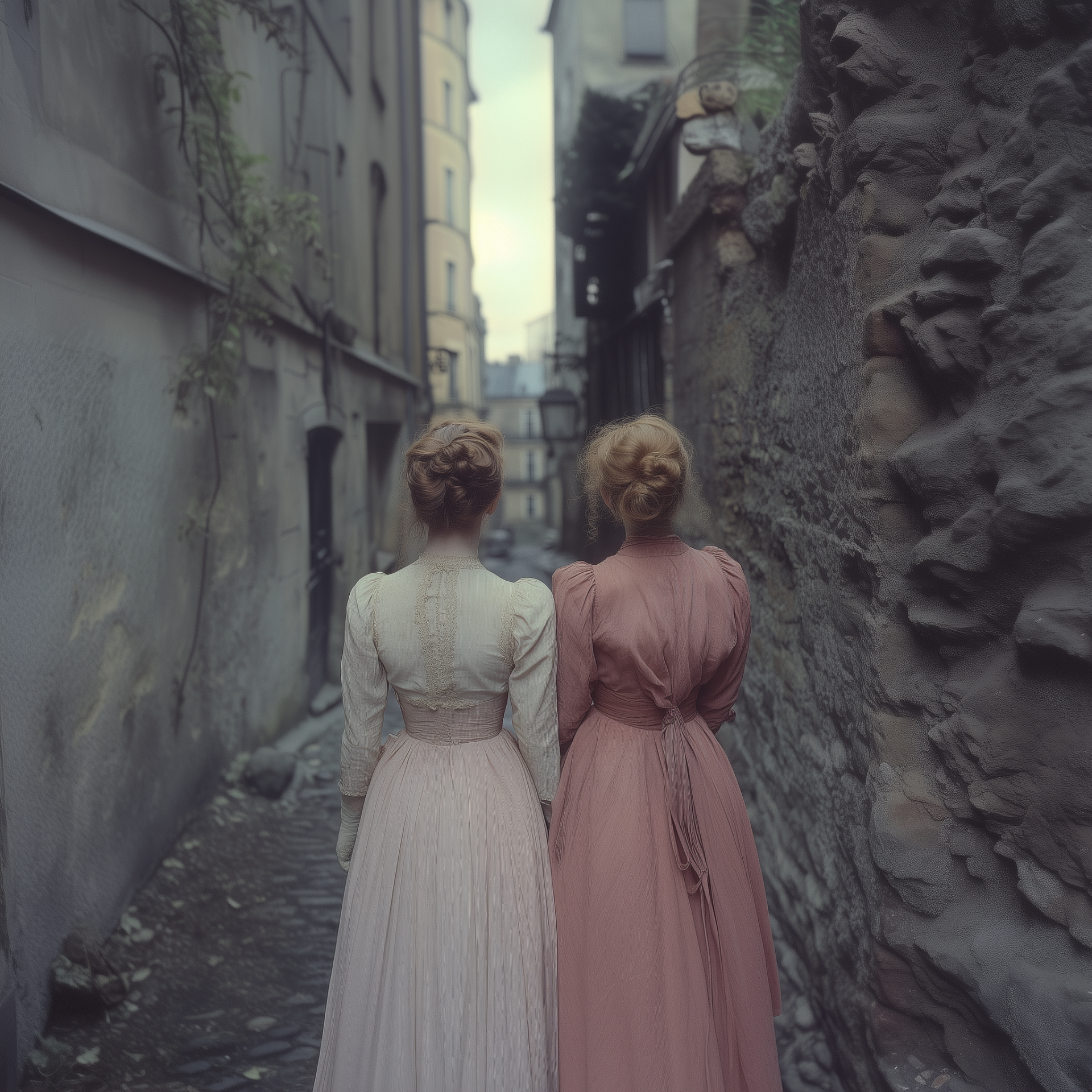 The image captures two young Swedish women standing in a quaint alley in Paris, their backs turned to the viewer, exuding an air of nostalgia. The color photography beautifully highlights the charm of the early 20th century, offering a glimpse into the past.